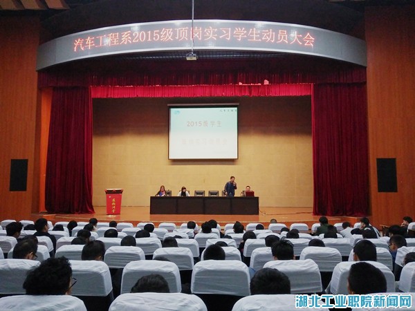 (文/王俐凤 图/邢彬)为了让2015级同学尽快适应顶岗实习生活,汽车工程系于10月24日下午在会议中心召开2015级学生顶岗实习动员会。保卫处处长胡现敏,汽车工程系主任张健、党总支书记王俐凤出席了会议,党总支副书记梁军萍主持会议。张健详细介绍了学生顶岗实习的意义、顶岗实习管理、顶岗实习手册填写、顶岗实习与就业的关系以及顶岗实习的注意事项。要求同学们首先要高度重视顶岗实习这一教学环节,顶岗实习既是对高职高专学生进行职业素质方面的强化训练,也是使学生提前了解社会、增强岗位意识和岗位责任感,最大限度提高综合素养的一项举措;其次要求同学们迅速转变观念,尽快适应环境;同时鼓励同学们在顶岗实习期间,要学习企业的先进文化、员工爱岗敬业、吃苦耐劳的精神,并掌握一定的专业技能和实践经验。