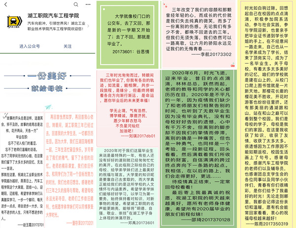 活动涵盖了“一句话——驻留耳畔的岁月”展板留言、“一张照片——光影流转的华年”照片分享、“一个瞬间——踏寻足迹,回忆时光”足印母校和“一份美好——献给母校”青春寄语等主题,邀请毕业生在展板上写下师生间、同窗间的深深祝福,分享抗疫风采、校园景点打卡等精彩瞬间,相约踏访母校并参与洁美校园活动,在微博、微信、贴吧等平台上对母校大声说爱。通过系列主题活动的开展,让毕业生在致敬青春、展望未来中,增进对母校的认同感与归属感。