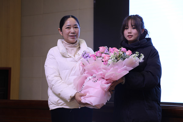 讲座结束后,学生代表向杨国华老师献花致敬,校党委副书记肖海华为杨老师颁发了兼职辅导员聘书。