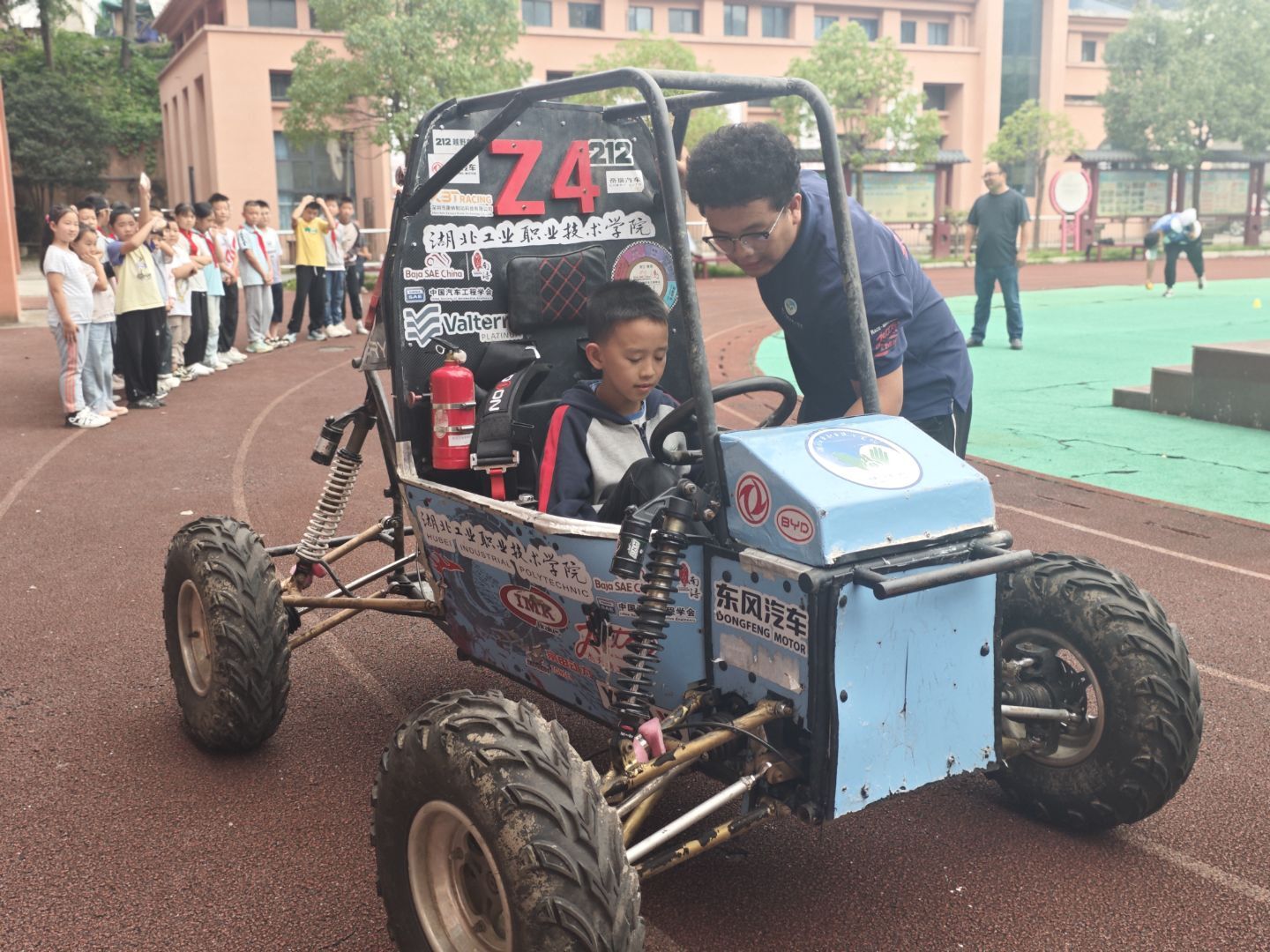理论刚落,实战登场。车手徐正康把赛车缓缓开到操场中央,在划定的200米跑道完成蛇形绕桩、小跳台演示等项目,现场的欢呼声盖过了发动机声。几位原本躲在老师身后的低年级学生,也冲上前竖起大拇指。