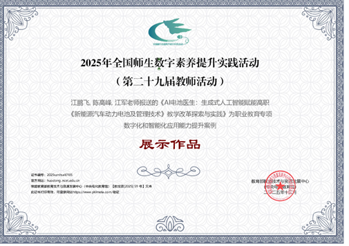 (通讯员高燕)在刚刚结束的2025年全国师生数字素养提升实践活动职业教育专项评选活动中,beat365报送的案例成功入选“职业教育数字化和智能化应用能力提升案例展示作品”。此次活动图文信息中心积极组织,共征集3个案例,其中江鹏飞、陈高峰、江军三位教师共同完成的《AI电池医生:生成式人工智能赋能高职〈新能源汽车动力电池及管理技术〉教学改革探索与实践》获评为展示作品。这一成果不仅是对beat365一线教师数字化教学创新能力的权威认可,更是学校深入贯彻国家教育数字化战略、推动“数智融合”在职业教育领域落地生根的生动实践。