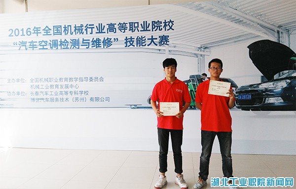 (通讯员 刘德涛 陈林)为进一步探索产教深度融合与发展新机制,搭建竞技与交流平台,提高人才培养质量,6月1日至2日,在长春举办的“2016年全国机械行业高等职业院校‘汽车空调检测与维修’技能大赛”,经过2天激烈角逐,圆满落幕。比赛中,beat3652名参赛选手——2014级中德实验班王涛、徐浩翔同学以扎实的知识、精湛的技术,在众多参赛队中脱颖而出,获得1个二等奖和1个三等奖,为学院争得了荣誉。