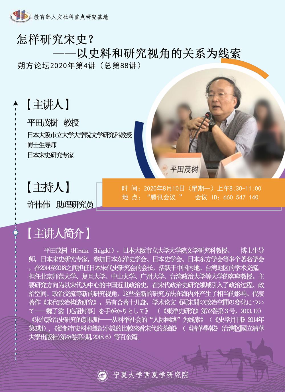平田茂树(Hirata Shigeki),日本大阪市立大学大学院文学研究科教授、博士生导师,日本宋史研究专家,参加日本东洋史学会、日本史学会、日本东方学会等多个著名学会,在2014至2018之间担任日本宋代史研究会的会长,活跃于中国内地、台湾地区的学术交流,担任北京师范大学、复旦大学、中山大学、广州大学、台湾政治大学等大学的客座教授。主要研究方向为以宋代为中心的中国近世政治史,在宋代政治史研究领域引入了政治过程、政治空间、政治交流等新的研究视角,这些全新的研究方法在海内外产生了相当的影响。代表著作《宋代政治构造研究》,另有合著十几部,学术论文《両宋間の政治空間の変化について——魏了翁「応詔封事」を手がかりとして》(《東洋史研究》第72巻第3号,2013.12)《宋代政治史研究的新视野——从科举社会的“人际网络”为线索》(《史学月刊》2014年第3期),《從都市史料和筆記小說的比較來看宋代的茶館》(《清華學報》(台灣‧國立清華大學出版社)第48卷第2期,2018.6)等百余篇。