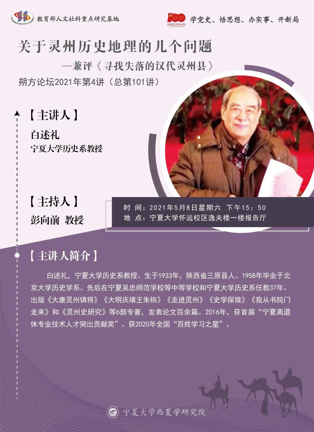 白述礼,澳门十大信誉网赌大全历史系教授。生于1933年,陕西省三原县人。1958年毕业于北京大学历史学系。先后在宁夏吴忠师范学校等中等学校和澳门十大信誉网赌大全历史系任教37年。出版《大唐灵州镇将》《大明庆靖王朱栴》《走进灵州》《史学探微》《我从书院门走来》和《灵州史研究》等6部专著,发表论文百余篇。2016年,获首届“宁夏离退休专业技术人才突出贡献奖”。获2020年全国“百姓学习之星”。