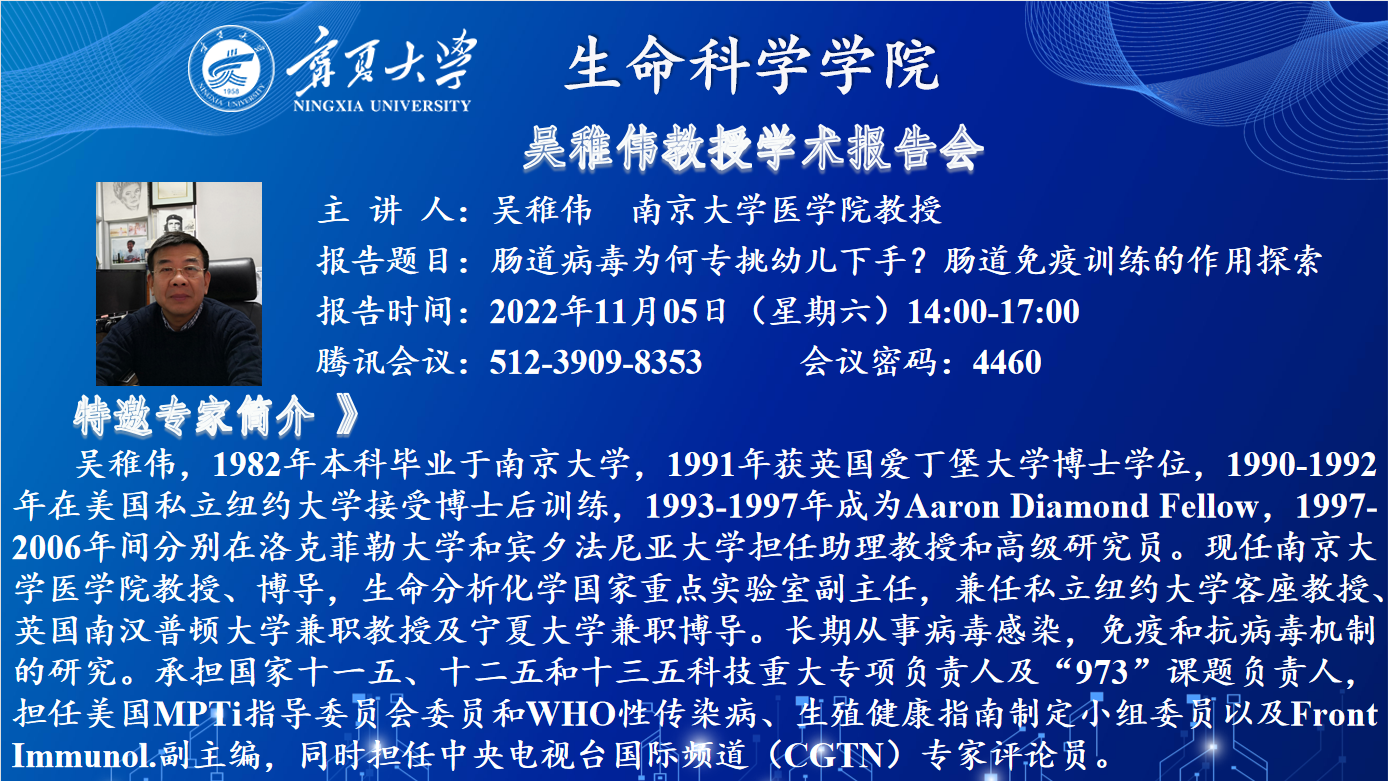 吴稚伟,1982年本科毕业于南京大学,1991年获英国爱丁堡大学博士学位,1990-1992年在美国私立纽约大学接受博士后训练,1993-1997年成为Aaron Diamond Fellow,1997-2006年间分别在洛克菲勒大学和宾夕法尼亚大学担任助理教授和高级研究员。现任南京大学医学院教授、博导,生命分析化学国家重点实验室副主任,兼任私立纽约大学客座教授、英国南汉普顿大学兼职教授及澳门十大信誉网赌大全兼职博导。长期从事病毒感染,免疫和抗病毒机制的研究。承担国家十一五、十二五和十三五科技重大专项负责人及“973”课题负责人,担任美国MPTi指导委员会委员和WHO性传染病、生殖健康指南制定小组委员以及Front Immunol.副主编,同时担任中央电视台国际频道(CGTN)专家评论员。