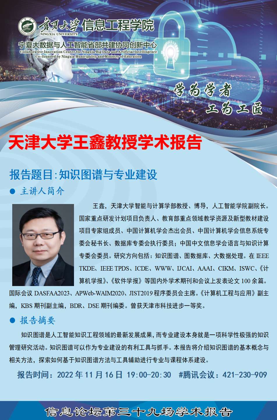 王鑫,天津大学智能与计算学部教授、博导,人工智能学院副院长。国家重点研发计划项目负责人、教育部重点领域教学资源及新型教材建设项目专家组成员、中国计算机学会杰出会员、中国计算机学会信息系统专委会秘书长、数据库专委会执行委员;中国中文信息学会语言与知识计算专委会委员。研究方向包括:知识图谱、图数据库、大数据处理。在IEEE TKDE、IEEE TPDS、ICDE、WWW、IJCAI、AAAI、CIKM、ISWC、《计算机学报》《软件学报》等国内外学术期刊和会议上发表论文100余篇。国际会议DASFAA2023、APWeb-WAIM2020、JIST2019程序委员会主席。《计算机工程与应用》副主编,KBS期刊副主编,BDR、DSE期刊编委。曾获天津市科技进步一等奖。
