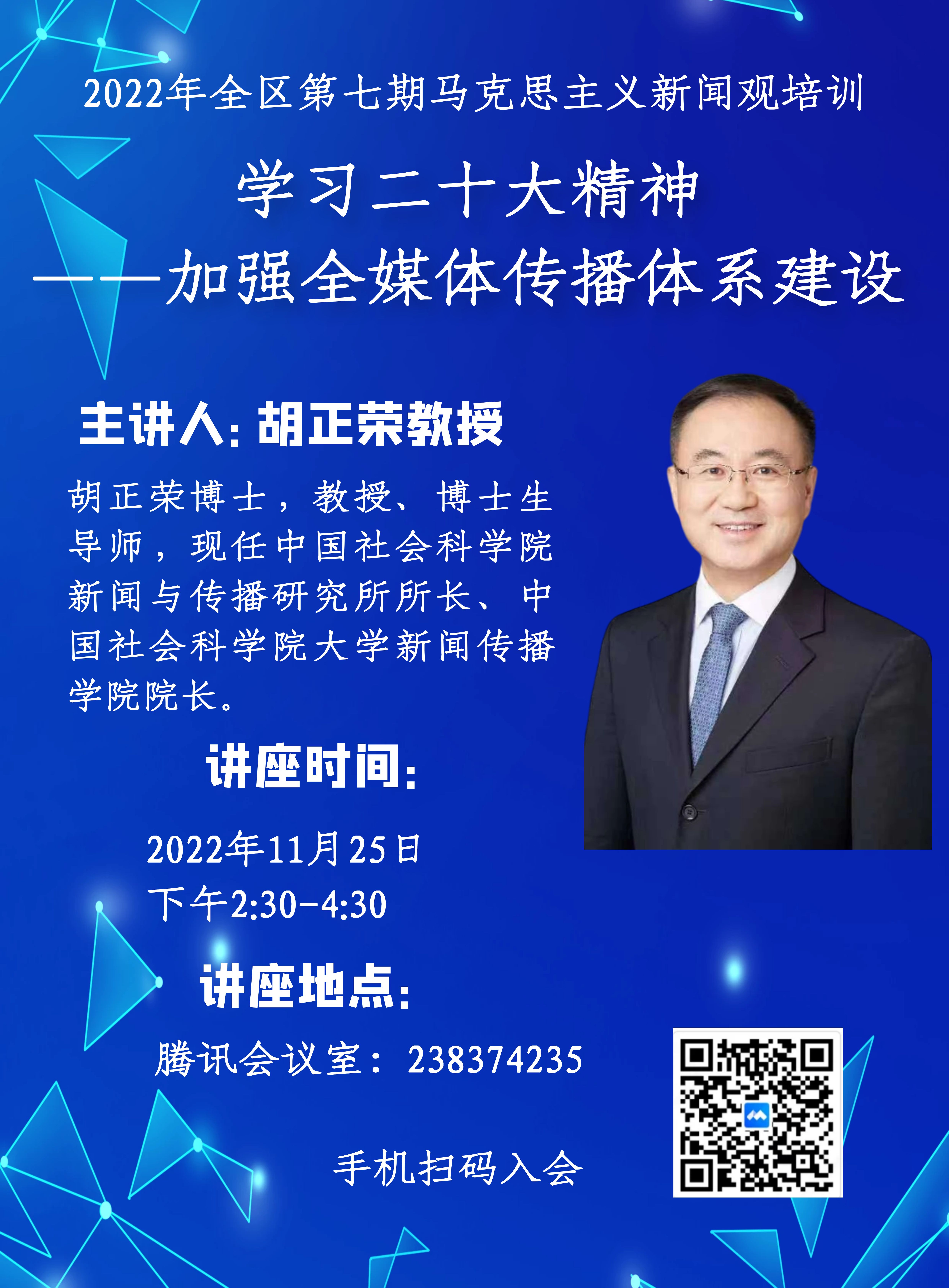 胡正荣,博士,教授、博士生导师,现任中国社会科学院新闻与传播研究所所长、中国社会科学院大学新闻传播学院院长;兼任中国电视艺术家协会副主席、中华全国新闻工作者协会常务理事、中国传播学会(中国新闻文化促进会传播学分会)会长等。