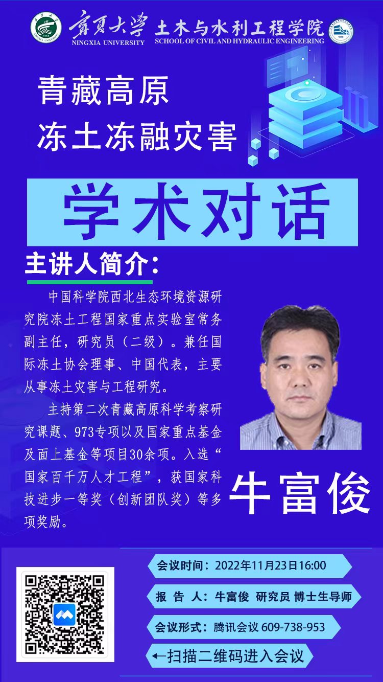 牛富俊,中国科学院西北生态环境资源研究院冻土工程国家重点实验室常务副主任,研究员(二级)。兼任国际冻土协会理事、中国代表;国际冻土协会(IPA)冻土工程工作组副组长等职。先后承担国家自然科学青年基金、面上基金、国际合作与交流项目、重点基金,科技部科技支撑计划项目专题、973专项前期课题,以及第二次青藏高原科学考察研究课题等30余项。发表论文300余篇,其中SCI收录论文100余篇,EI收录论文50篇。入选“国家百千万人才工程”,曾获国家科技进步一等奖(创新团队)奖、甘肃省科学技术进步一等奖3次,中国科学院杰出科技成就奖,中国铁道学会科学技术奖特等、一等、二等奖,中国铁道建筑总公司科学技术奖一等奖,中国公路学会特等、一等奖,第五届中国科协期刊优秀学术论文特别优秀学术论文奖,及中国地质学会第十一届青年地质科技奖(银锤奖)、中国地理学会第十届全国青年地理科技奖、第七届青藏高原研究会青年科技奖及兰州分院优秀导师奖、中科院优秀导师奖等,以及陕西省第一批“三秦学者”特聘专家,广东省科技创新领军人才,甘肃省领军人才(第一层次)。
