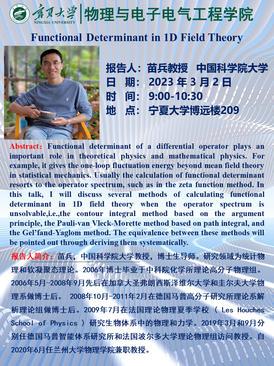 苗兵,中国科学院大学教授,博士生导师。研究领域为统计物理和软凝聚态理论。2006年博士毕业于中科院化学所理论高分子物理组。2006年5月-2008年9月先后在加拿大圣弗朗西斯泽维尔大学和圭尔夫大学物理系做博士后。2008年10月-2011年2月在德国马普高分子研究所理论系解析理论组做博士后。2009年7月在法国理论物理夏季学校( Les Houches School of Physics )研究生物体系中的物理和力学。2019年3月和9月分别任德国马普智能体系研究所和法国波尔多大学理论物理组访问教授。自2020年6月任兰州大学物理学院兼职教授。