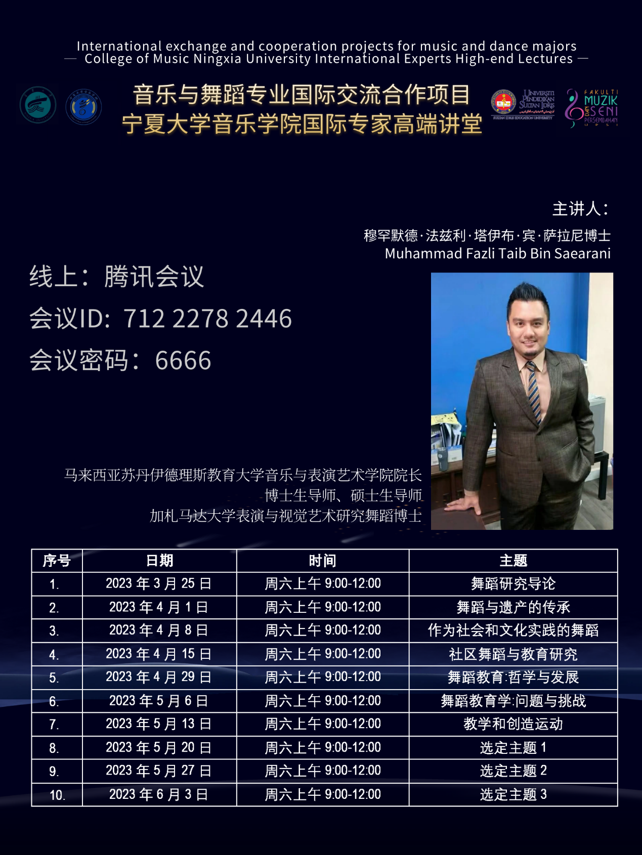 穆罕默德·法兹利·塔伊布·宾·萨拉尼博士,马来西亚苏丹依德理斯教育大学音乐与表演艺术学院院长,副教授,博士研究生导师,研究领域为舞蹈研究、舞蹈教学法、舞蹈传承、创造性律动教育。法兹利博士以优异的成绩毕业于印度尼西亚加查马达大学艺术学院荣获表演艺术和视觉艺术研究舞蹈博士学位,该研究是关于日惹古典宫廷舞蹈遗产中的舞蹈教育。