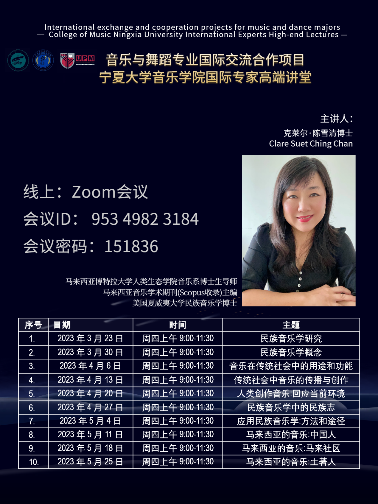 克莱尔·陈雪清,博士,马来西亚博特拉大学人类生态学院音乐系副教授,博士研究生导师,研究领域:民族音乐学。克莱尔博士于2002年至2022年在马来西亚苏丹依德理斯教育大学教育大学音乐与表演艺术学院任副院长(研究和研究生学习)和马来西亚音乐学术期刊(Scopus收录)主编。克莱尔博士还在2018年至2019年期间担任国际传统音乐理事会(ICTM)国家联络官,她现在是东南亚音乐总监会的执行委员会成员。