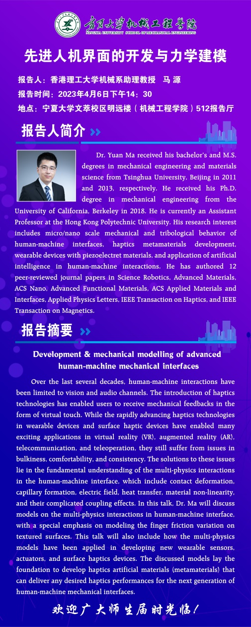 Dr. Yuan Ma received his bachelor’s and M.S. degrees in mechanical engineering and materials science from Tsinghua University, Beijing in 2011 and 2013, respectively. He received his Ph.D. degree in mechanical engineering from the University of California, Berkeley in 2018. He is currently an Assistant Professor at the Hong Kong Polytechnic University. His research interest includes micro/nano scale mechanical and tribological behavior of human-machine interfaces, haptics metamaterials development, wearable devices with piezoelectret materials, and application of artificial intelligence in human-machine interactions. He has authored 12 peer-reviewed journal papers in Science Robotics, Advanced Materials, ACS Nano, Advanced Functional Materials, ACS Applied Materials and Interfaces, Applied Physics Letters, IEEE Transaction on Haptics, and IEEE Transaction on Magnetics.
