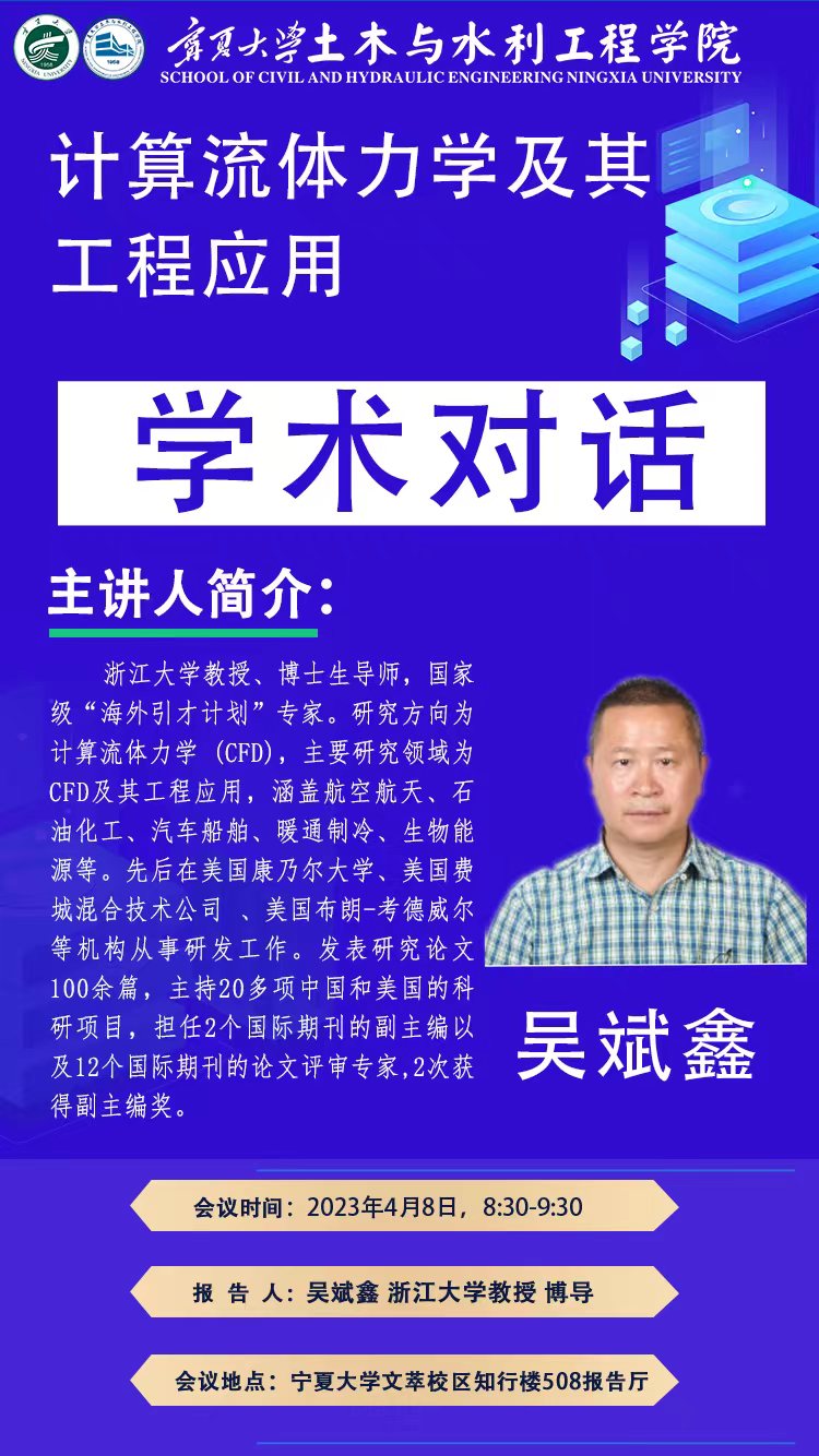 吴斌鑫博士,浙江大学教授、博士生导师,国家级“海外引才计划”专家。研究方向为计算流体力学(CFD),主要研究领域为CFD及其工程应用,涵盖航空航天、石油化工、汽车船舶、暖通制冷、生物能源等。先后在美国康乃尔大学、美国费城混合技术公司 、 美国布朗-考德威尔等机构从事研发工作。已发表研究论 文100余篇,主持20多项中国和美国的科研项目,担任2个 国际期刊的副主编以及12个国际期刊的论文评审专家,2次获得了杰出副主编奖。担任教育部相关重要奖项评审专家。