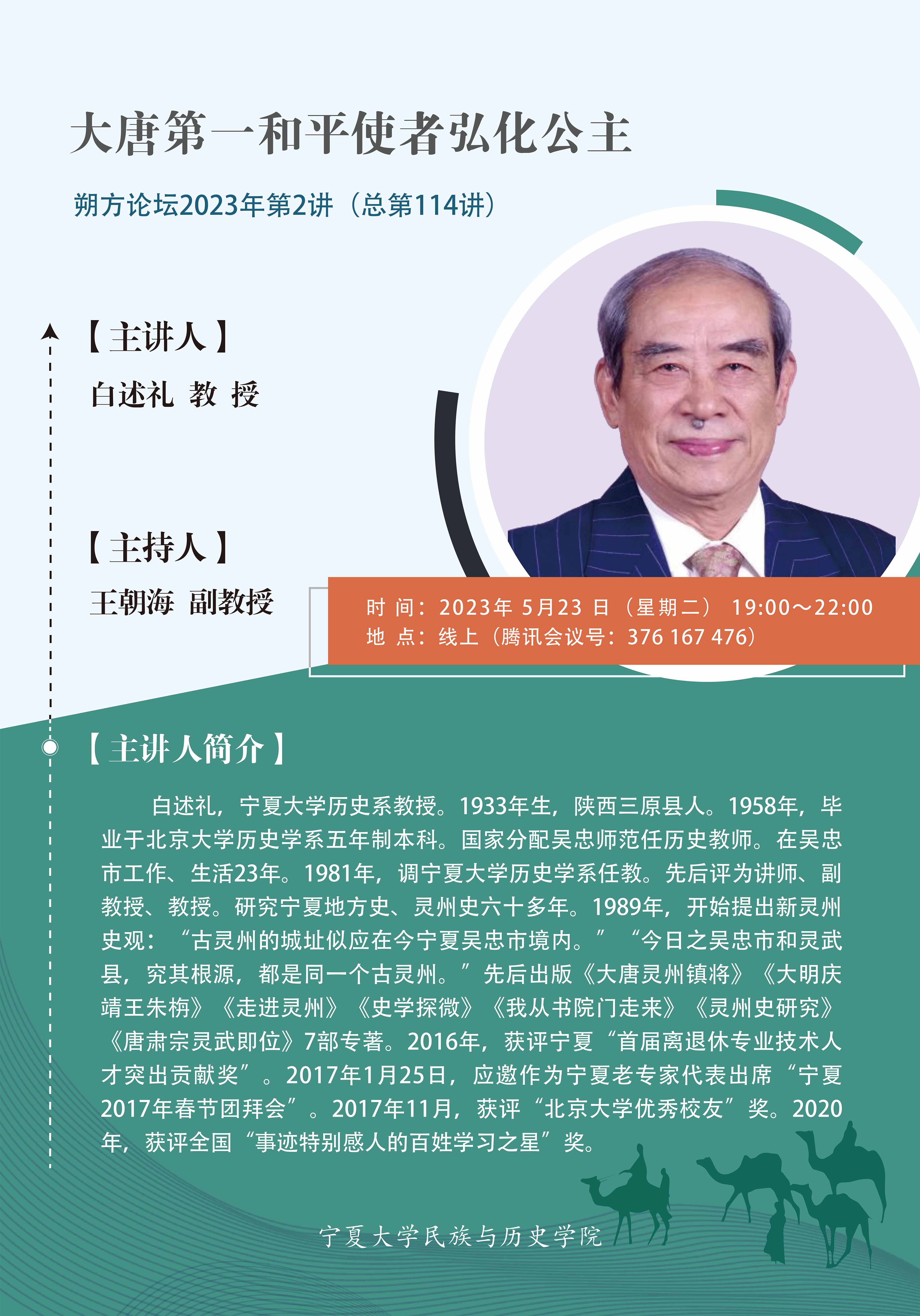 白述礼,澳门十大信誉网赌大全历史系教授。1933年生,陕西三原县人。1958年,毕业于北京大学历史学系五年制本科。国家分配吴忠师范任历史教师。在吴忠市工作、生活23年。1981年,调澳门十大信誉网赌大全历史学系任教。先后评为讲师、副教授、教授。研究宁夏地方史、灵州史六十多年。1989年,开始提出新灵州史观:“古灵州的城址似应在今宁夏吴忠市境内。”“今日之吴忠市和灵武县,究其根源,都是同一个古灵州。”先后出版《大唐灵州镇将》《大明庆靖王朱栴》《走进灵州》《史学探微》《我从书院门走来》《灵州史研究》《唐肃宗灵武即位》7部专著。2016年,获评宁夏“首届离退休专业技术人才突出贡献奖”。2017年1月25日,应邀作为宁夏老专家代表出席“宁夏2017年春节团拜会”。2017年11月,获评“北京大学优秀校友”奖。2020年,获评全国“事迹特别感人的百姓学习之星”奖。