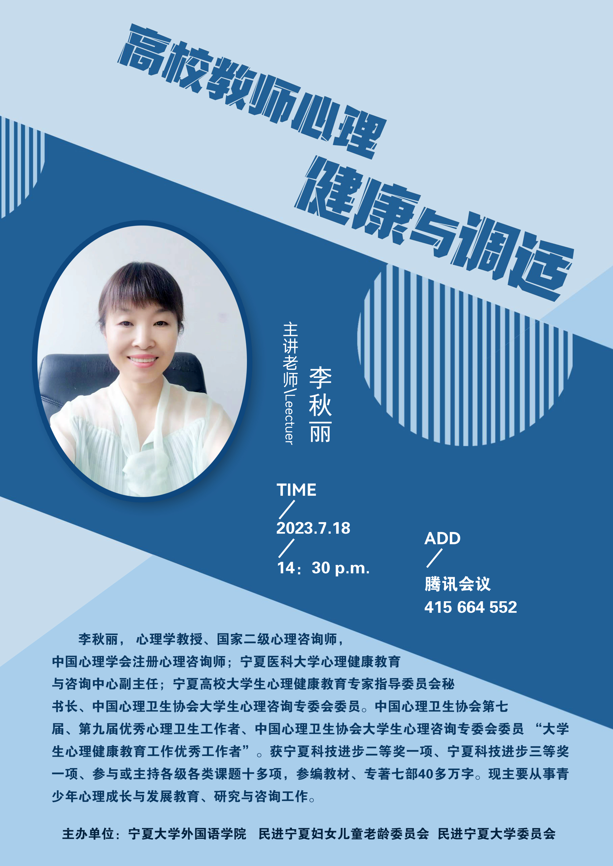 李秋丽,心理学教授、国家二级心理咨询师,中国心理学会注册心理咨询师;宁夏医科大学心理健康教育与咨询中心副主任;宁夏高校大学生心理健康教育专家指导委员会秘书长、中国心理卫生协会大学生心理咨询专委会委员。中国心理卫生协会第七届、第九届优秀心理卫生工作者、中国心理卫生协会大学生心理咨询专委会委员“大学生心理健康教育工作优秀工作者”。获宁夏科技进步二等奖一项、宁夏科技进步三等奖一项、参与或主持各级各类课题十多项,参编教材、专著七部40多万字。现主要从事青少年心理成长与发展教育、研究与咨询工作。
