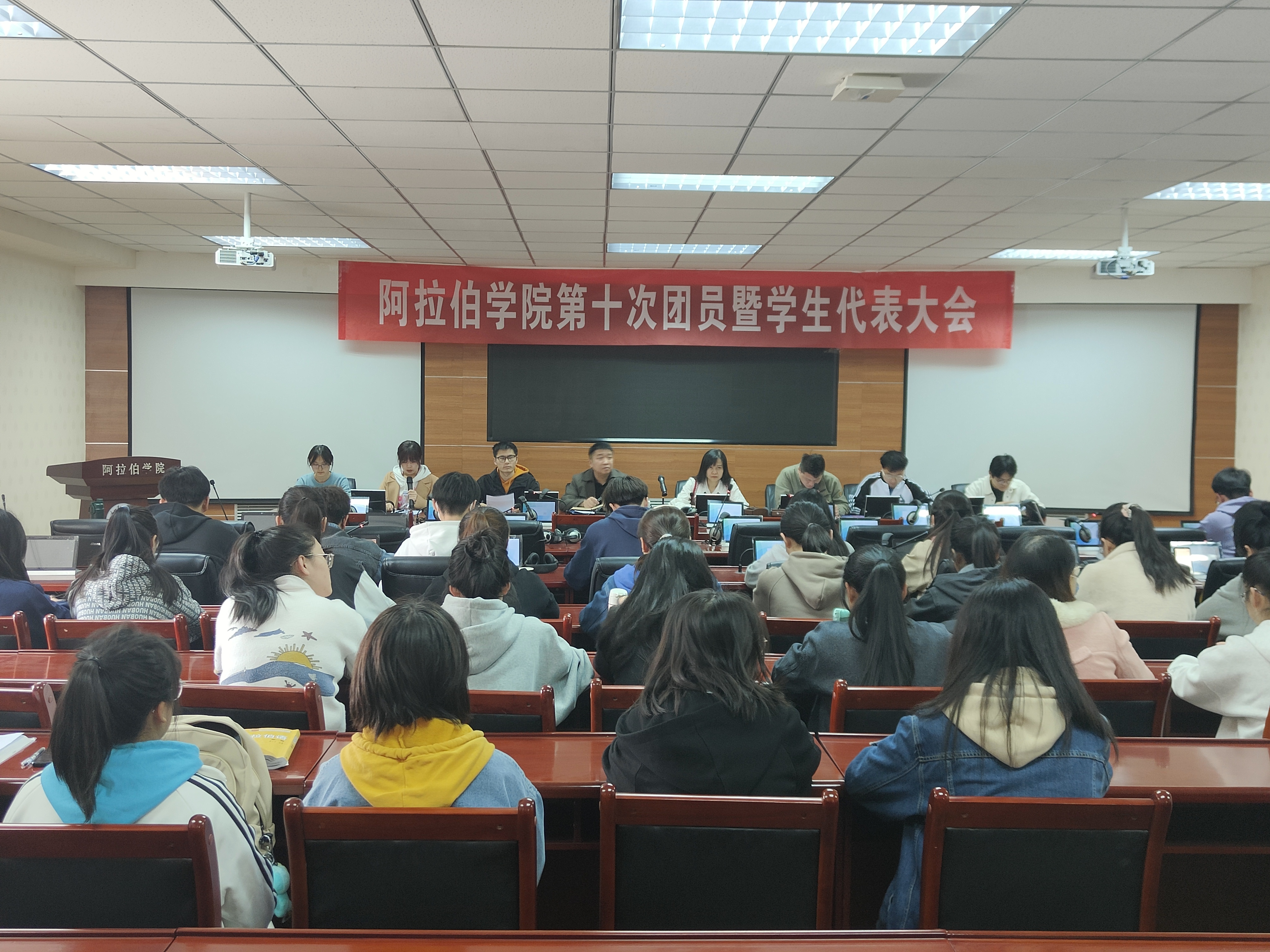 【澳门十大信誉网赌大全新闻中心讯 阿拉伯学院】3月9日下午,阿拉伯学院于文萃校区知行楼8楼报告厅召开第十届团员暨学生代表大会。学院党总支书记李海燕、副书记赵永军、学办主任金宁洋、各班学生代表参加会议。