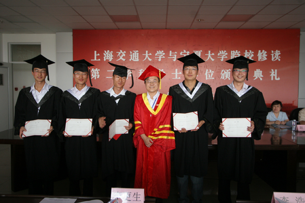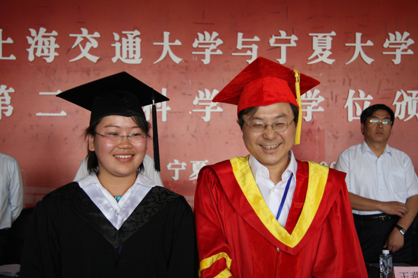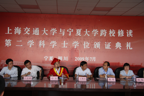 上海交通大学教务处处长江志斌教授宣读了学位授予名单和对跨校修读上海交通大学第二学科学士学位2009届优秀毕业生的表彰决定。印杰教授为获得上海交通大学第二学科学士学位的同学颁发学位证书并拨流苏。同时为获得优秀毕业生的杨仟等五位同学颁发了获奖证书和奖金。学生代表冶永伟代表全体获得学位证书的同学发表了毕业感言。
