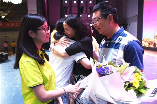 各学院学生代表向教师、辅导员代表献花,感谢师恩、感谢学校。全场毕业生起立向老师鞠躬致谢。