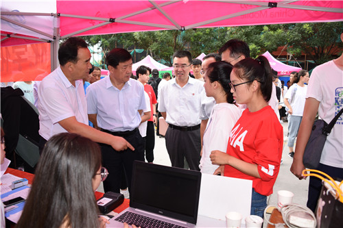 校领导一行来到各学院的新生报到服务咨询点,耐心询问报到情况,详细了解报到流程和所需时间,阅览了各学院的迎新服务宣传单及新生指南,并与服务咨询点附近的学生与家长亲切交谈,对各学院给予新生的关怀和学生的创意给予了极大的肯定。