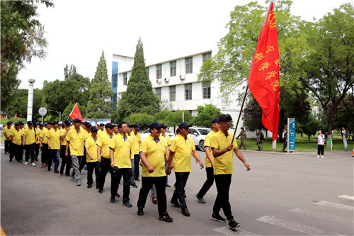随后,校领导带领身着统一文化衫的2600余名教职工阔步向前,以各分工会会旗为队形引导标志组成健步走队伍,由怀远校区体育场西南大门出发,沿思贤路、经励学路、凌云路等经天桥进入贺兰山校区,沿明德路、民族路等过文萃路地下通道进入文萃校区,经明志路、行健路等到达终点文萃校区体育场,全程约5公里。