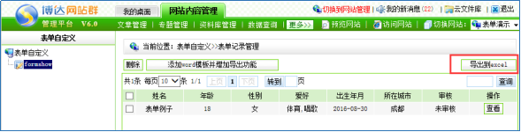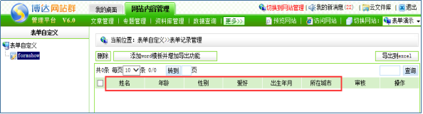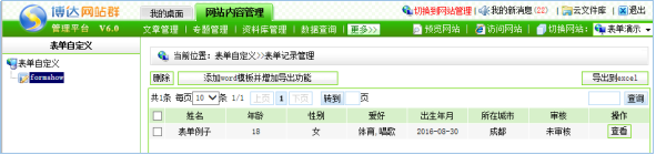 在网站内容管理的表单自定义节点下,点击左侧对应表单的名字节点,可以浏览该表单在前台所提交的所有表单信息,如(图2-8),也可以点击每条数据对应的
