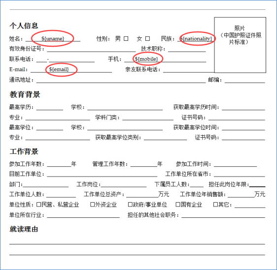 word文档中每个参数的值以${uname}的形式填写,注意${ }中放置的参数是每个对应表单控件的name属性值,例如<input name="uname" id="uname" type="text" value="" null='false' nullmsg='请填写姓名' title='姓名'>,如果要在word中显示姓名的值,在姓名处放置${uname},其它信息显示和姓名类似,如图3-3-1所示。