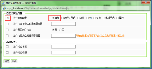 点击插入按钮,弹出自定义属性配置窗口,因为只需添加日期类型,所以只勾选控件类型选项,以及选择日期选项。
