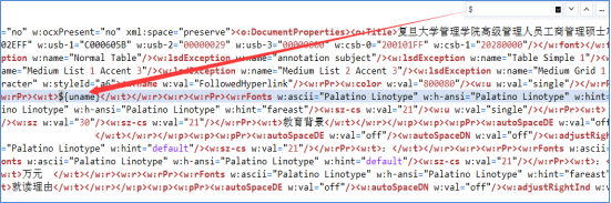 用编辑工具将.xml文件打开。如图3-3-3所示,搜索带有$符号的地方,查看${ }中内容是否为空,如果为空检查原word文件中${ }中是否没有配置参数,如果有请补全或删除后重复上述步骤,或者直接将.xml文件中参数为空的${}删除。因为如果${}中不配置对应的参数,那么导出word文档时会出错。