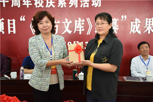 教育厅副厅长王春秀接受了国家图书馆出版社向自治区“古文献整理与地域文化研究”人文社科重点研究基地赠送的《国学基本典籍丛刊》《中华传统文化百部经典》等图书。