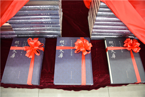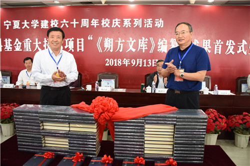 宁夏社会科学届联合会书记主席杨占武与何建国为《朔方文库》揭幕。