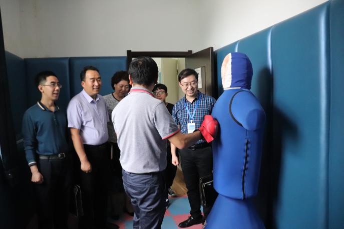 李学峰一行还实地考察了信誉网赌心理健康中心的沙盘室、放松减压室等场地的使用和设计情况,详细了解心理咨询中心周边环境和办公条件。