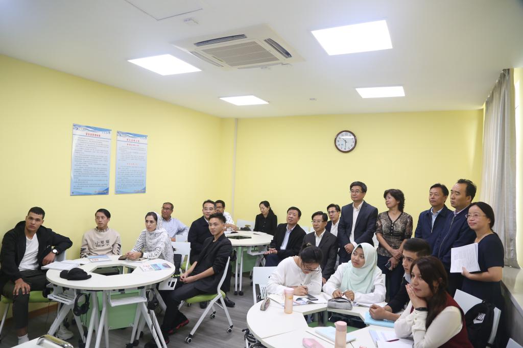 在国际教育学院,校领导听取了学院负责人关于开学准备、留学生线上教学方案等情况汇报。随后,校领导深入课堂,与留学生“同上一堂课”。