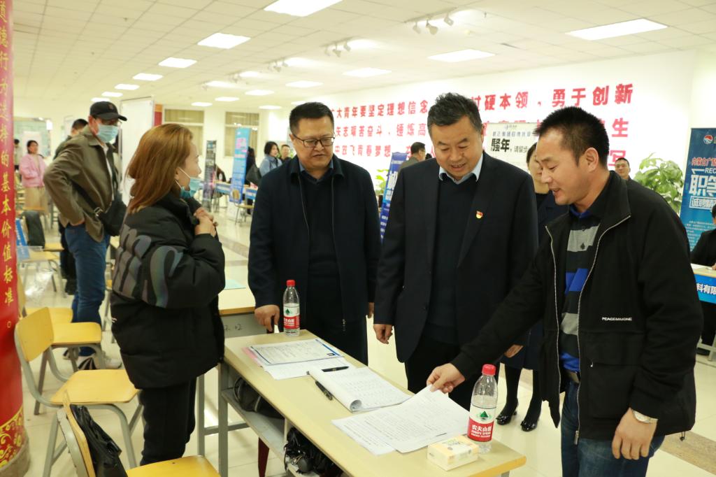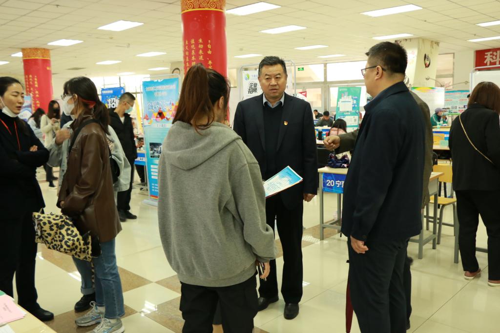 李建设认真查看参会企业展位,与来自浙江、内蒙、陕西、宁夏等区内外的企业招聘负责人进行交谈,听取他们对学校人才培养、专业设置、就业服务等方面的意见和建议,并询问了各企业具体需求岗位、往年招收情况、企业基本情况等。在与毕业生交流中,李建设鼓励他们找准定位、把握机遇、主动出击尽早与心仪企业签约。