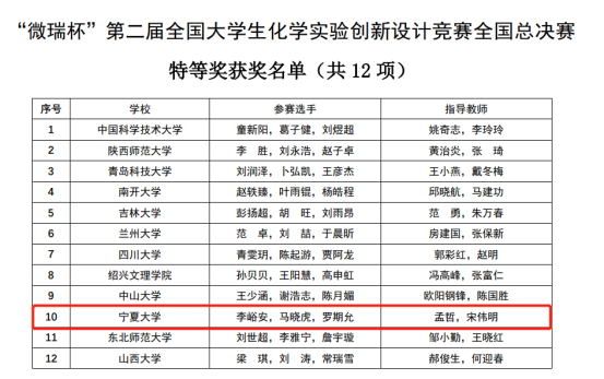 全国大学生化学实验创新设计竞赛分为大区赛、总决赛两个阶段,来自全国超过800支队伍参加比赛。在西北赛区比赛中,由化学化工学院学生李峪安、马晓虎、罗期允和指导教师孟哲、宋伟明组成的信誉网赌代表队获得西北赛区一等奖,成为宁夏高校唯一入围全国总决赛的队伍。总决赛中,信誉网赌团队奋勇拼搏,同来自中国科学技术大学、浙江大学、同济大学在内的90支代表队展开激烈角逐,最终以优异成绩荣获特等奖。这是信誉网赌化学一流本科专业建设中取得的又一佳绩,也是信誉网赌紧紧围绕立德树人根本任务,全面提高人才培养质量的又一硕果。