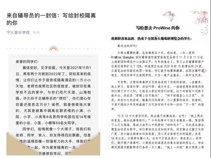 疫情发生后,澳门十大信誉网赌大全党委学生工作部(学生处)迅速反应,根据学校疫情防控相关要求紧急作出安排部署,各学院辅导员第一时间通过QQ、微信、电话、腾讯会议等多种方式与学生联系,掌握实时动态,提醒学生做好疫情防护措施,全面摸排相关情况。全体学工人本着“全覆盖、无漏缺”的原则,对各学院学生应在校、实在校、因事请假、校外实习及区内外活动等情况做到心中有数,准确、及时完成“日报告”“零报告”工作,逐人建立健康台账;对居家隔离和集中隔离的学生及时送去关怀、表达慰问,有针对性地开展心理疏导,叮嘱学生配合疫情防控部门做好隔离工作,切实做到一人一档,全员覆盖。“收到”“一切正常”……这些平常不过的回复已成为宁大学工人在高度戒备工作状态下的高频词,他们紧锣密鼓的工作常态为全校学生筑起了一道无形的安全屏障。