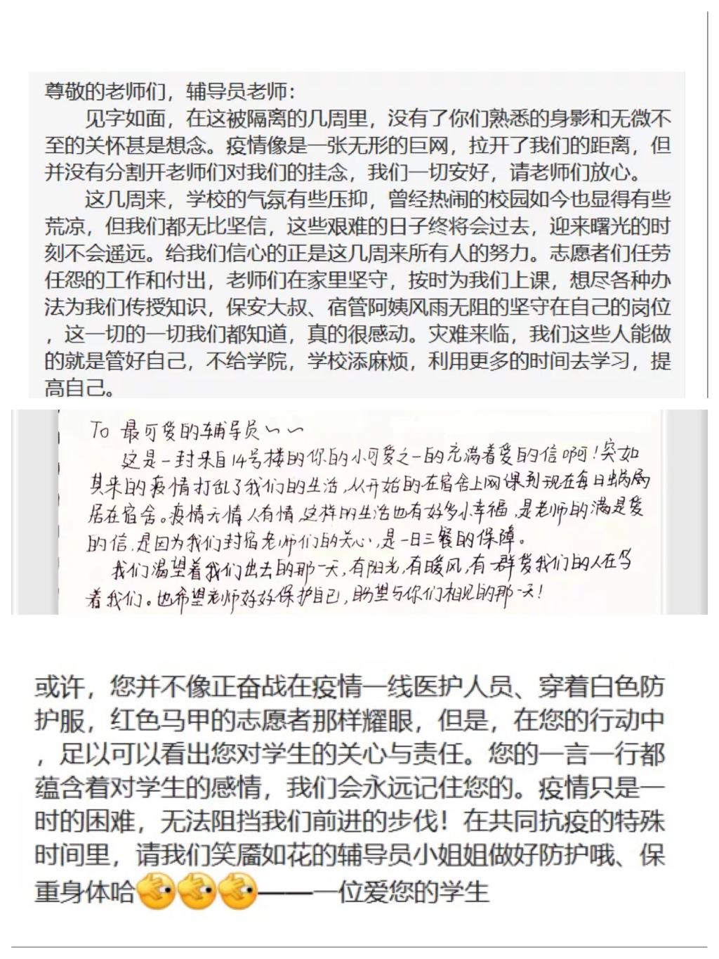 一笺书信,一腔温情。一封封温暖书札穿越光纤空投至手机屏幕上,“各位小可爱能否经营好自己的生活,让心和胃一起被安抚妥当?”“都说一日之计在于晨,虽然目前暂停了跑操,但仍希望同学们早起锻炼身体,合理规划时间。”“你们那抹志愿红和寒冬秋日里响彻云霄的青春抗‘疫’号角牵动着我的心,让我为之感动。”字里行间,涌动着辅导员在特殊时期对学生们的嘘寒问暖和殷切期待,疫情防控教育、爱国情怀培育、心理健康辅导等也搭乘着书信便车有效发力,话思念动之以情,传信心晓之以理,聊感恩化之以心,谈成长导之以行,诸此满满正能量在学生中引起了积极反响。