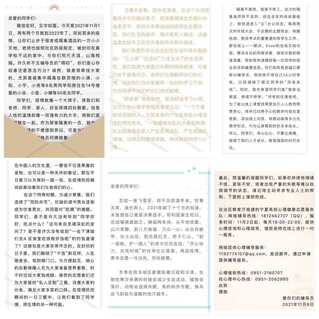 【澳门十大信誉网赌大全新闻中心讯 冯禹君/文、各学院/图】“见字如晤,展信颜安!”本次疫情发生后,澳门十大信誉网赌大全坚持学生疫情防控工作和思想政治教育两手抓、两手硬,全体学生工作队伍坚守在服务学生一线,先后围绕“隔离师生谈心”“一日三餐关心”“学习生活引导”“为志愿者点赞”“心理健康辅导”等主题为学生书写了饱含深情的“一封信”,引起了全校学生共克时艰的强烈共鸣,凝聚了师生同心战“疫”的精神力量。