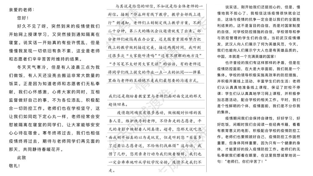 书翰寄心,情意拳拳。学生们也纷纷回信,“来书收悉,展信舒颜。”“老师辛苦了!尽管天气寒冷,但我们心里是暖和的。”“希望老师们别太劳累,一定照顾好自己。”“疫情当前,我们须得有当代青年之自觉,不能一味陷入自我情绪之中。”书短情长,在向奋战在疫情防控一线默默付出、无私奉献的老师们表达感恩之情的同时,学生们说人生思考、谈学习进步、表战“疫”决心,用赤子之心畅叙青春誓言。