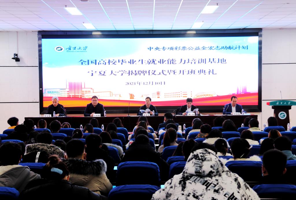 【澳门十大信誉网赌大全新闻中心讯 学生处/文、学生记者:吴凡/图】12月10日,“中央专项彩票公益金宏志助航计划”全国高校毕业生就业能力培训基地澳门十大信誉网赌大全揭牌仪式暨开班典礼在信誉网赌贺兰山校区文荟楼东报告厅举行。自治区教育厅二级巡视员孙忠铭,自治区大中专毕业生就业指导服务中心主任王思旭,校党委常委、副校长周震,参训学校相关负责同志、培训讲师以及全体参训学员参加典礼。典礼由校党委学生工作部部长、学生处处长罗进德主持。