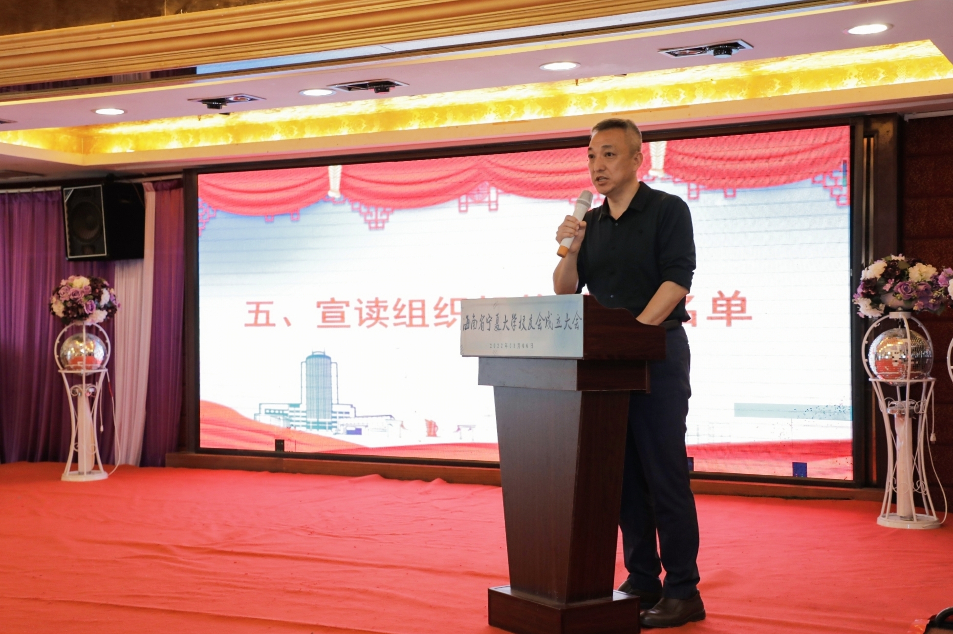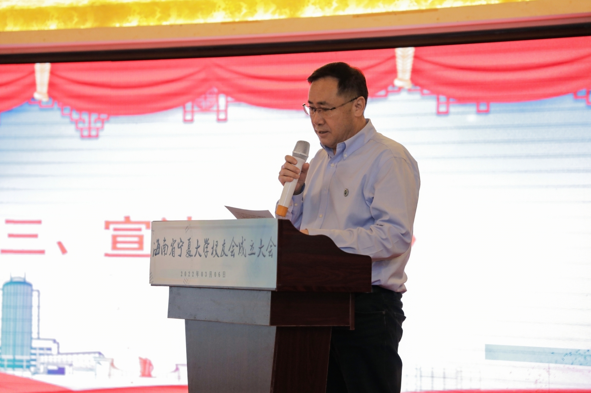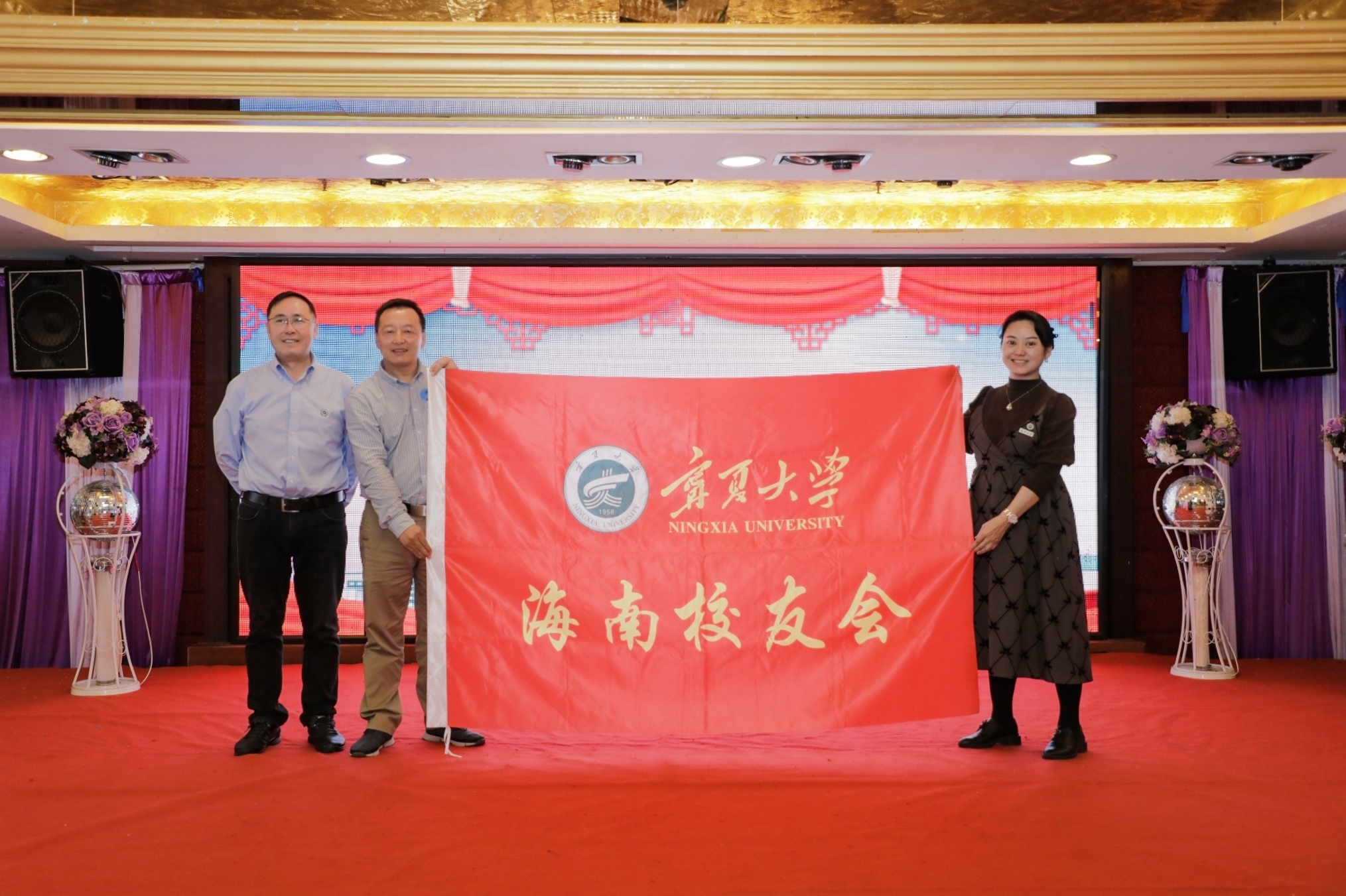 李建设为第一届理事会成员颁发聘书,谢应忠向海南校友会授旗。