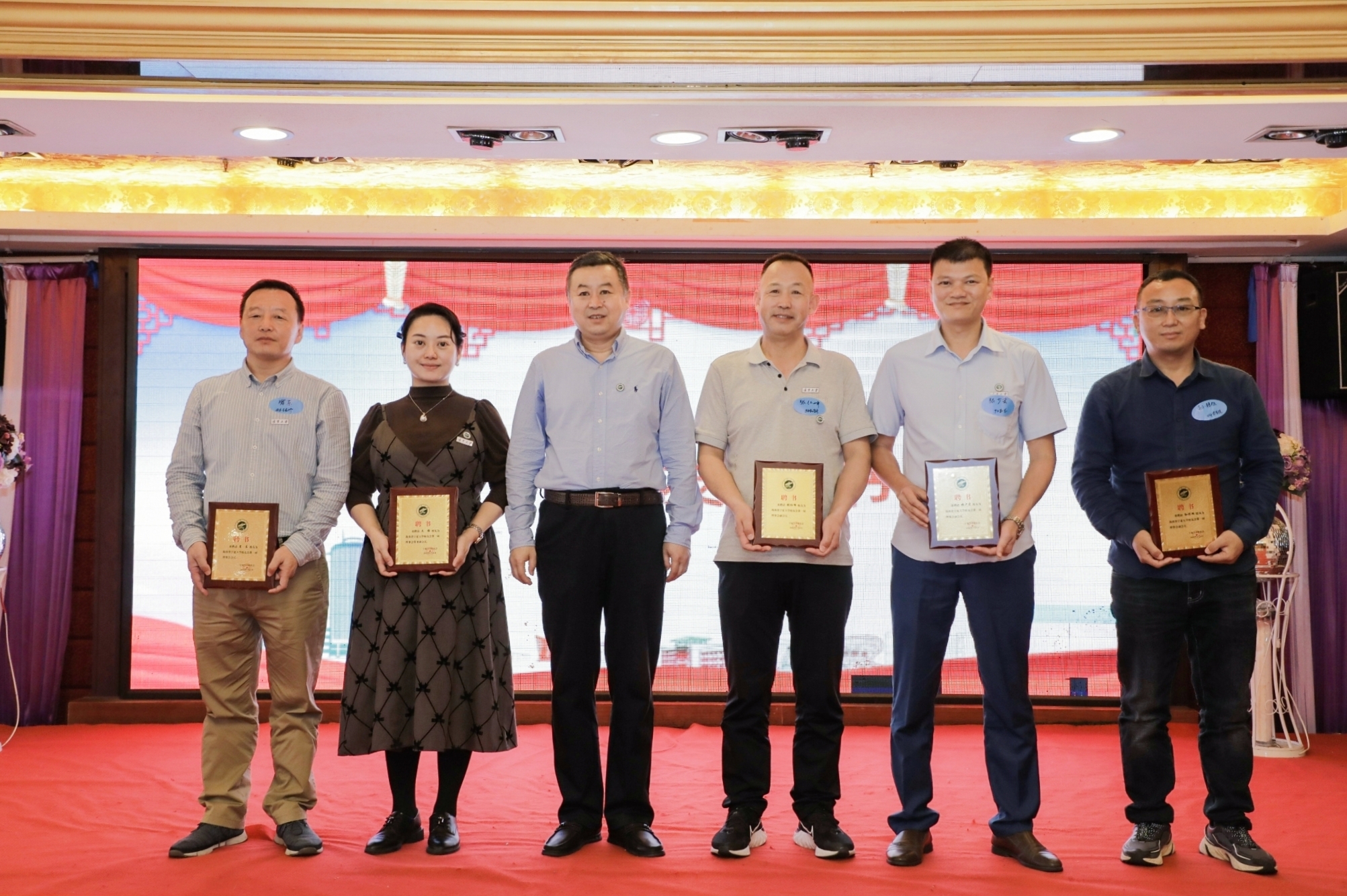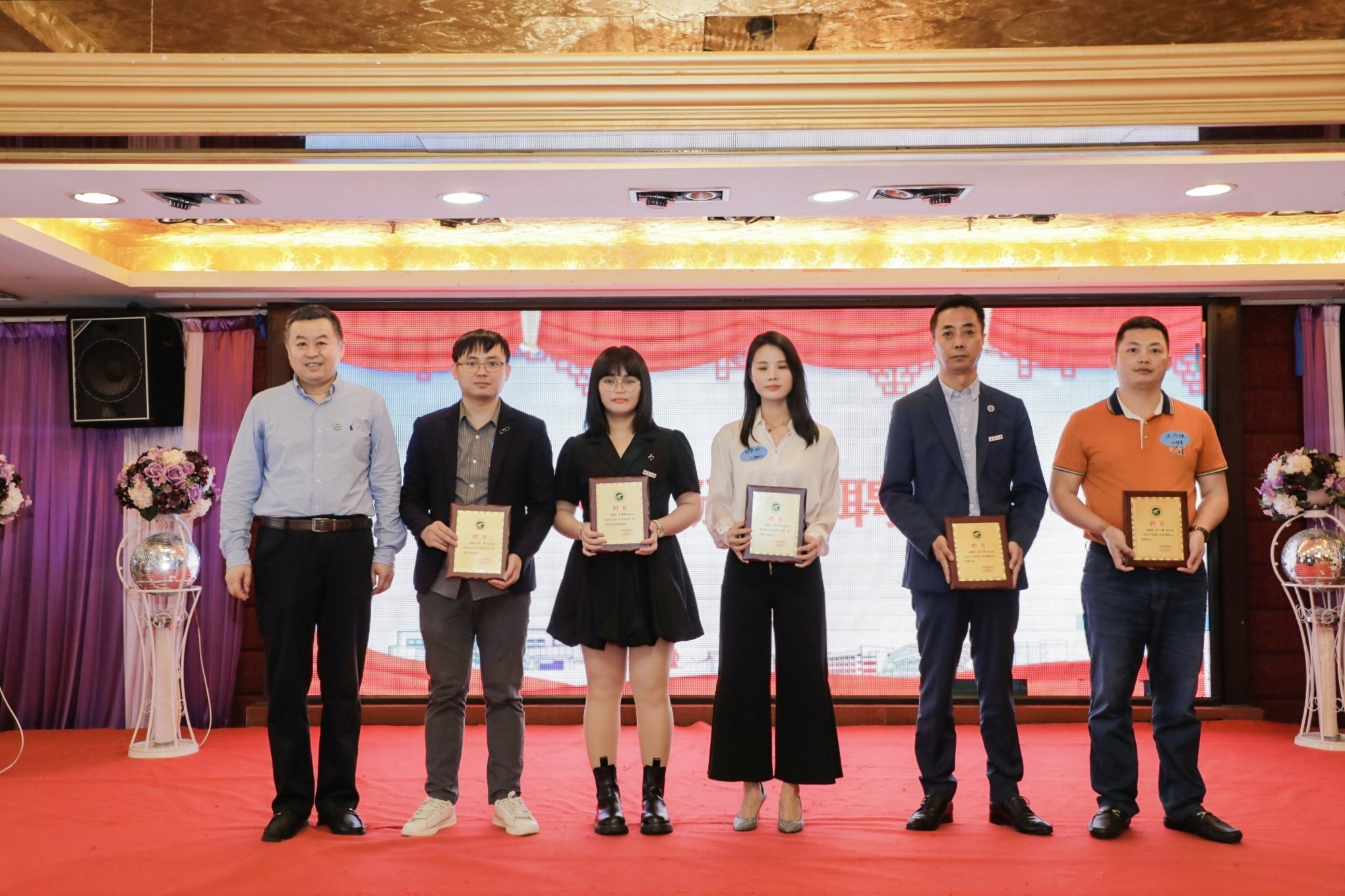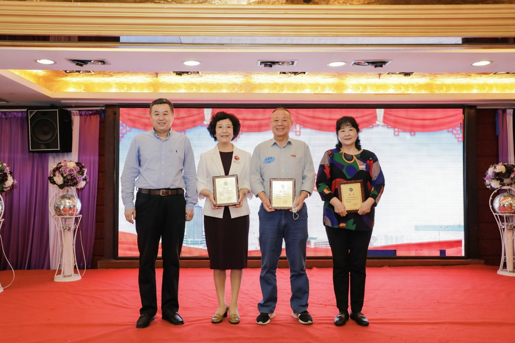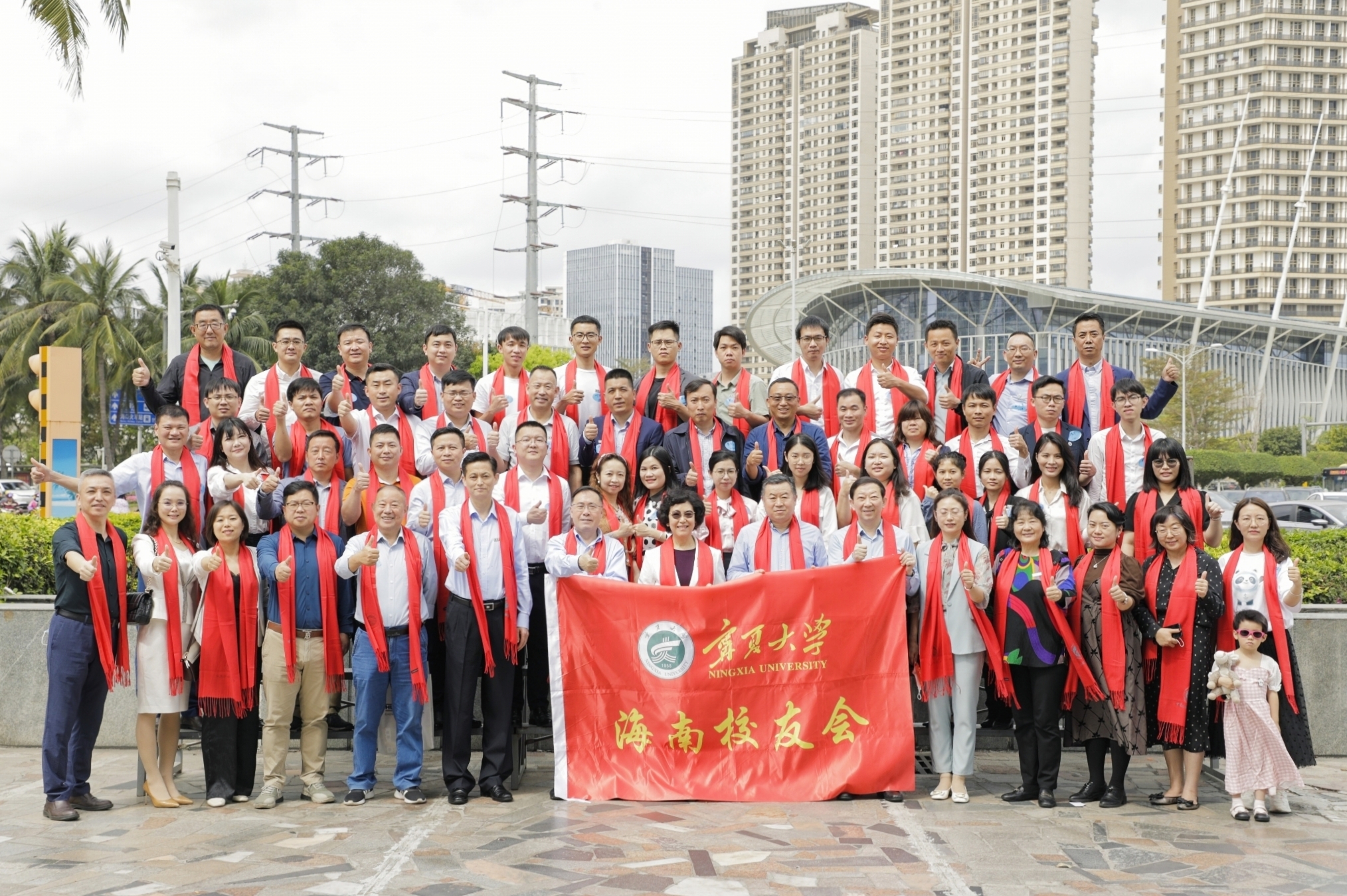 李建设为第一届理事会成员颁发聘书,谢应忠向海南校友会授旗。