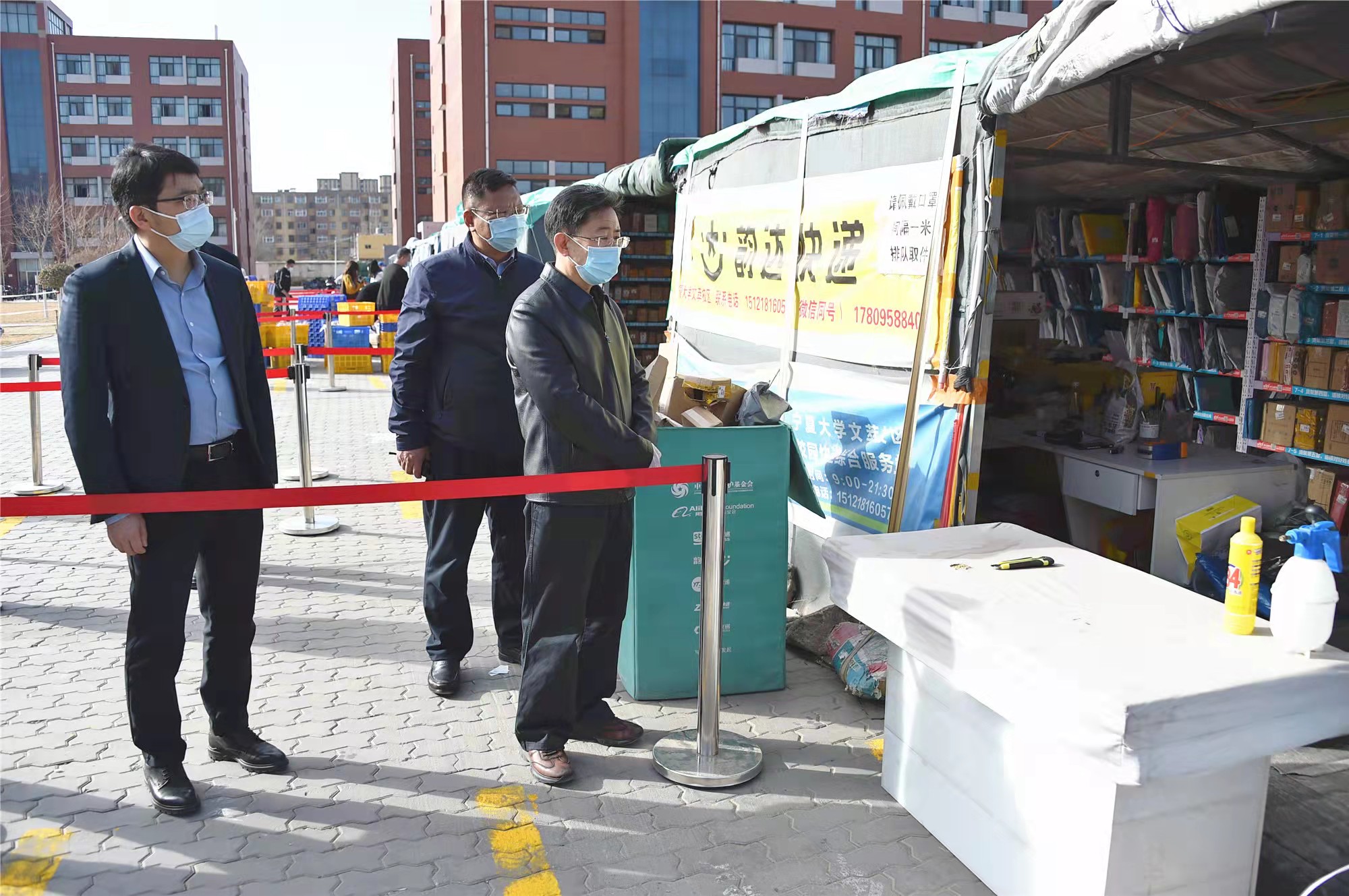 在文萃校区快递点,校领导向现场工作人员了解师生领取快递的流程及快递点和包裹消毒情况,要求各快递点工作人员严格遵照医用酒精浓度标准在快递取拆点配备洗手消毒酒精,全面消杀、妥善处置快递盒,不给“物传”留有任何空隙;在校医院,校领导听取了医护人员对发热学生的应急处置、隔离房间配备、核酸检测流程等情况的汇报,实地查看了防护服、免洗消毒凝胶、84消毒液、利尔康泡腾片、防疫口罩等防护物资的储备情况,嘱咐医护人员要时刻做好应急准备,配合属地做实校园疫情防控医疗保障工作;在贺兰山校区新百超市,校领导详细了解超市管理和生活物资供应情况,要求超市管理人员严把食品安全和价格管理关,坚决杜绝售卖过期食品,不得以任何理由抬高商品价格,充分保障学生的消费权益。