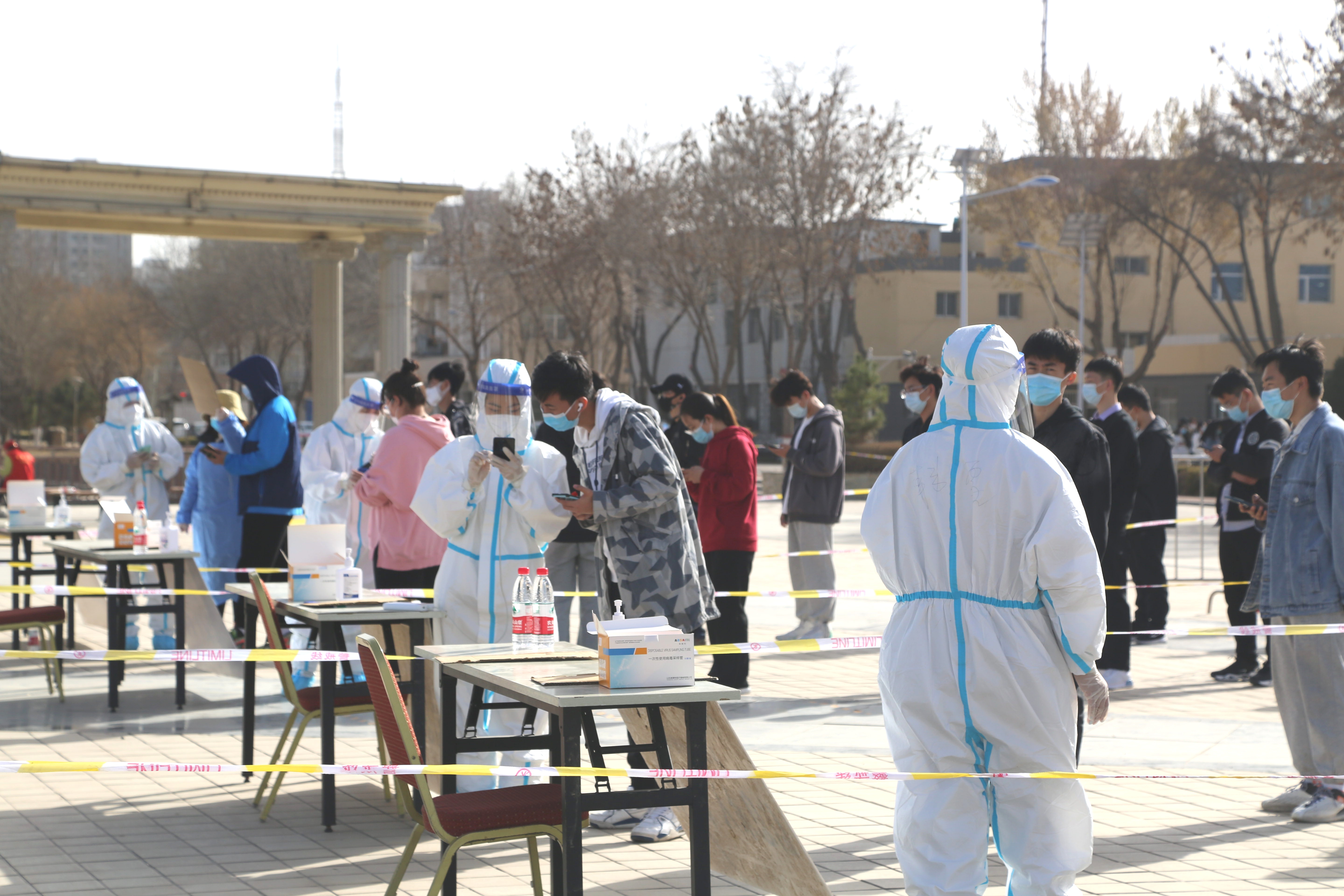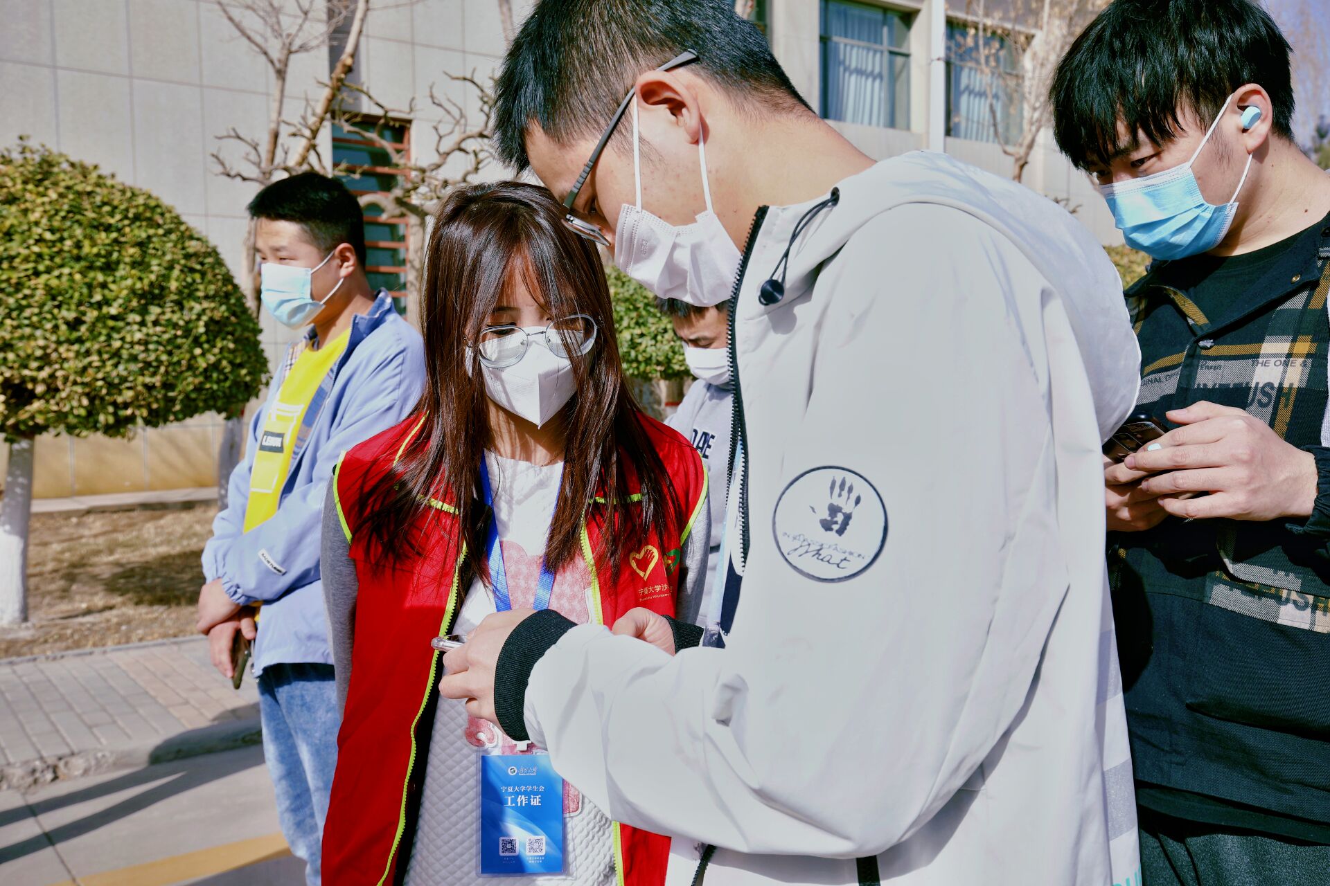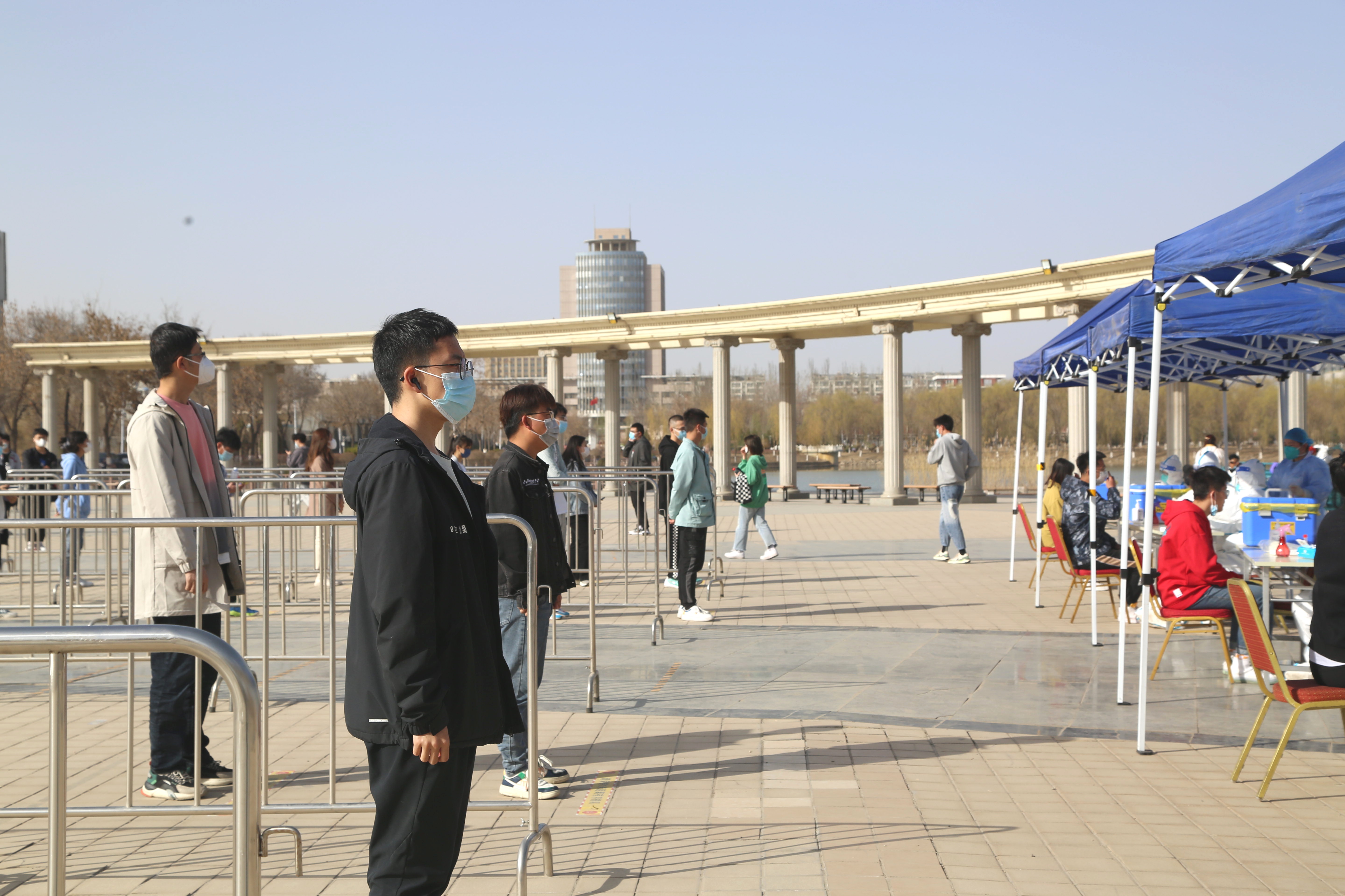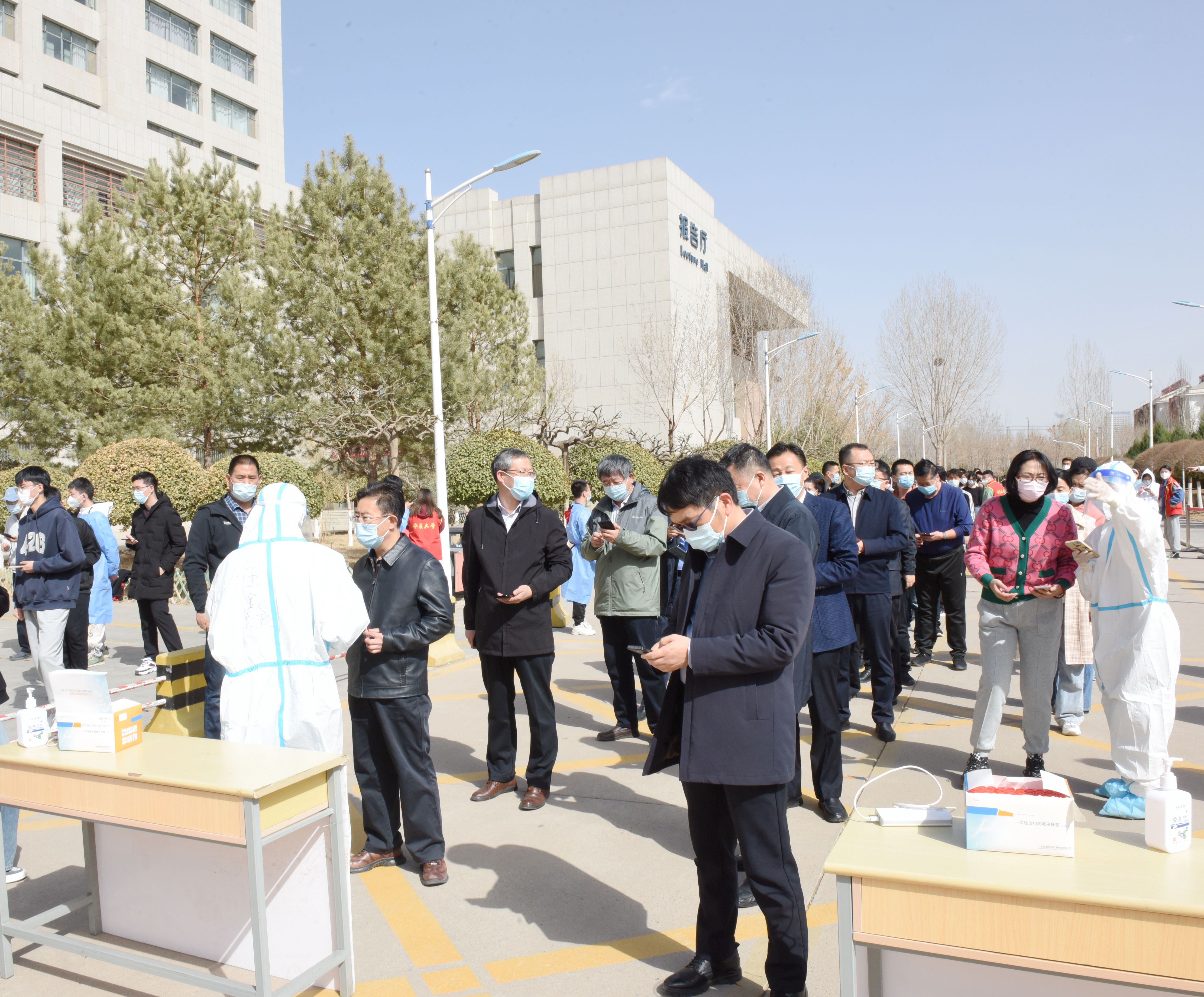 检测现场,师生员工分时段、分批次提前完成队伍集结,跟随志愿者的引导前往检测地点,在进入等候区时戴口罩间隔1米,登录“我的宁夏”进行身份核验、信息登记,经现场检查扫码验证后,每10人一组进入采样区,“请坐,将头微微后仰,张开嘴,啊——,可以了……。”整个检测流程从采样到离场,工作人员和受检人员各司其职、密切配合,现场调控指挥得当,保障队伍暖心服务,志愿者们无私奉献,历时近7个小时,共完成21648份咽拭子采样任务。