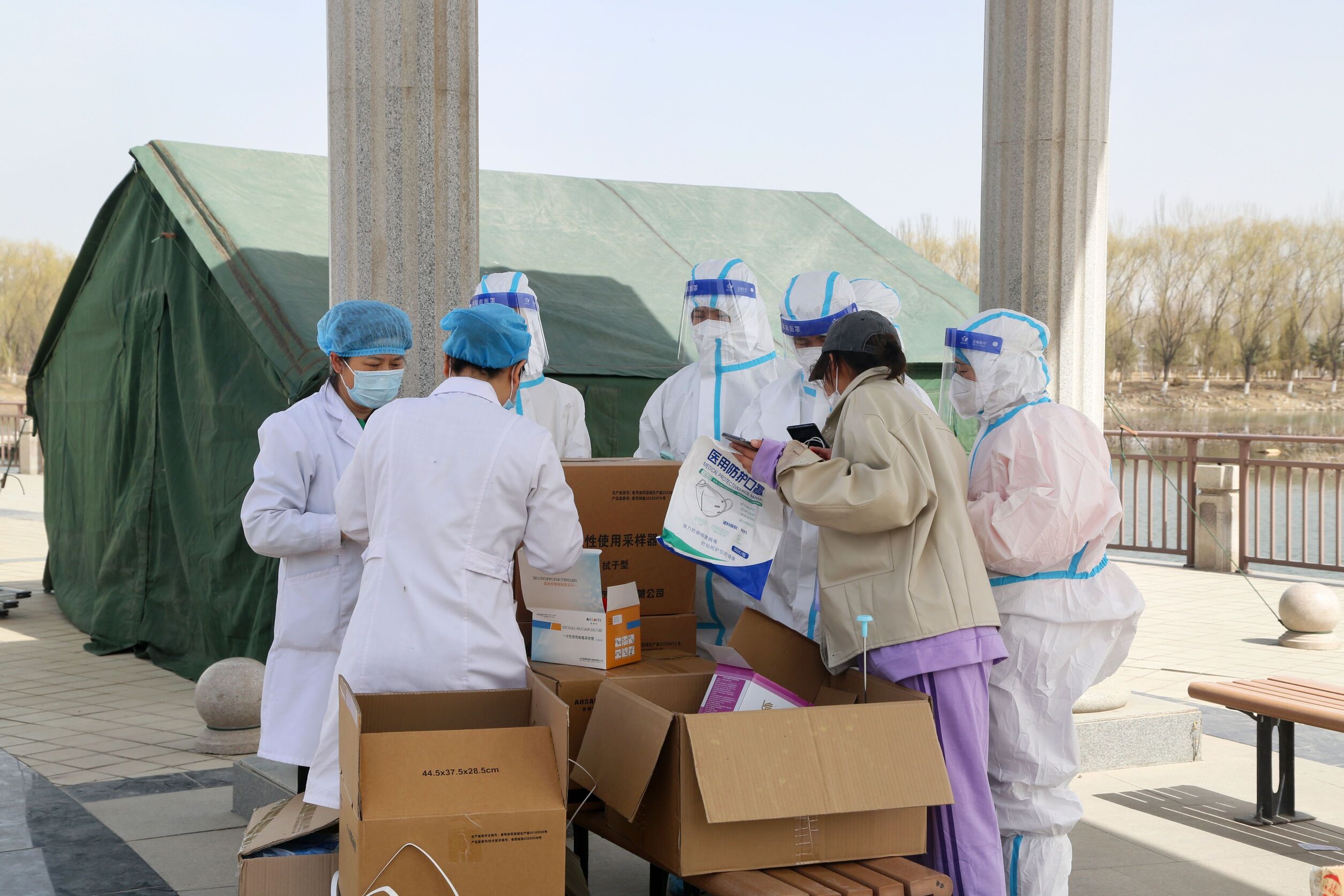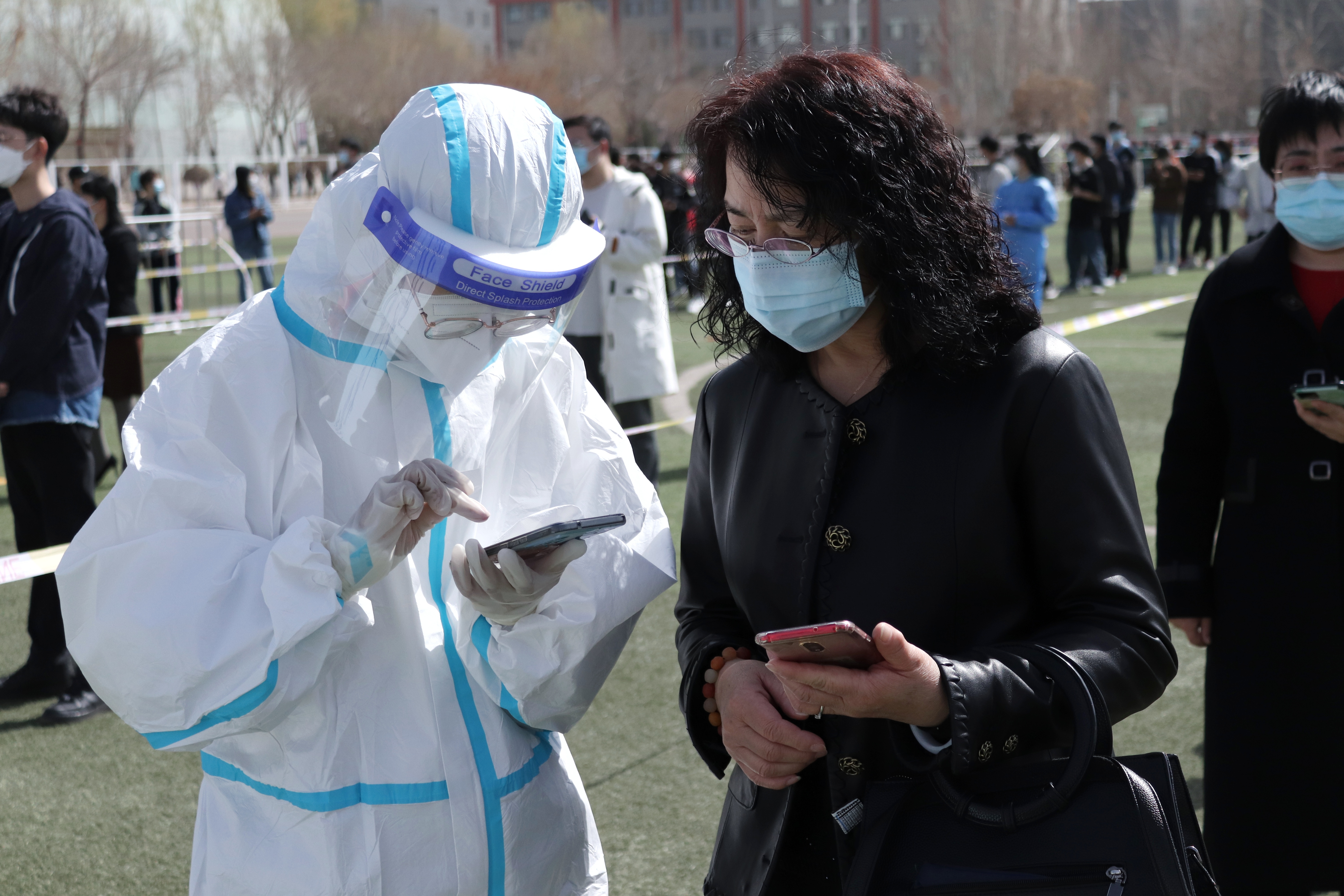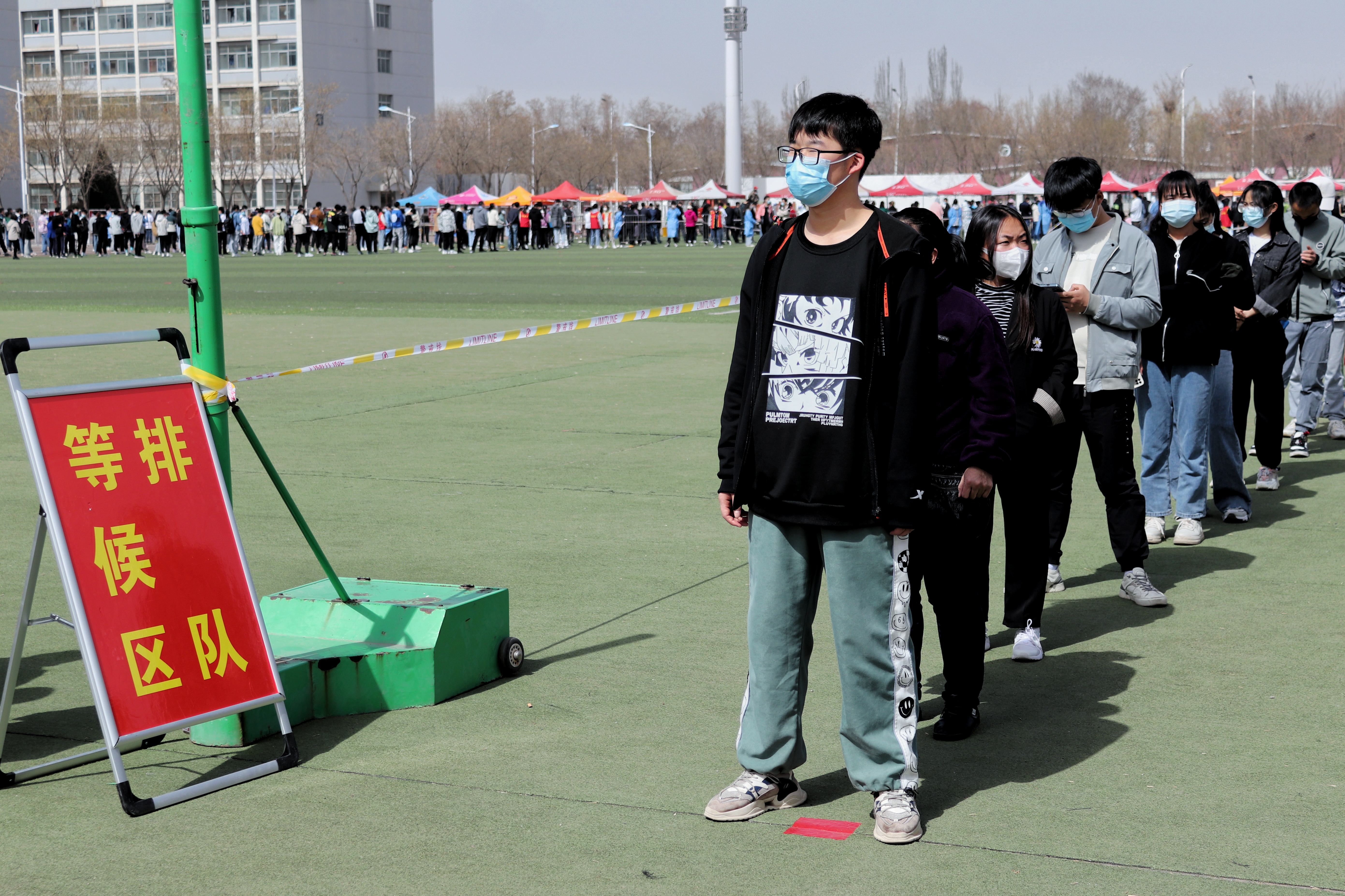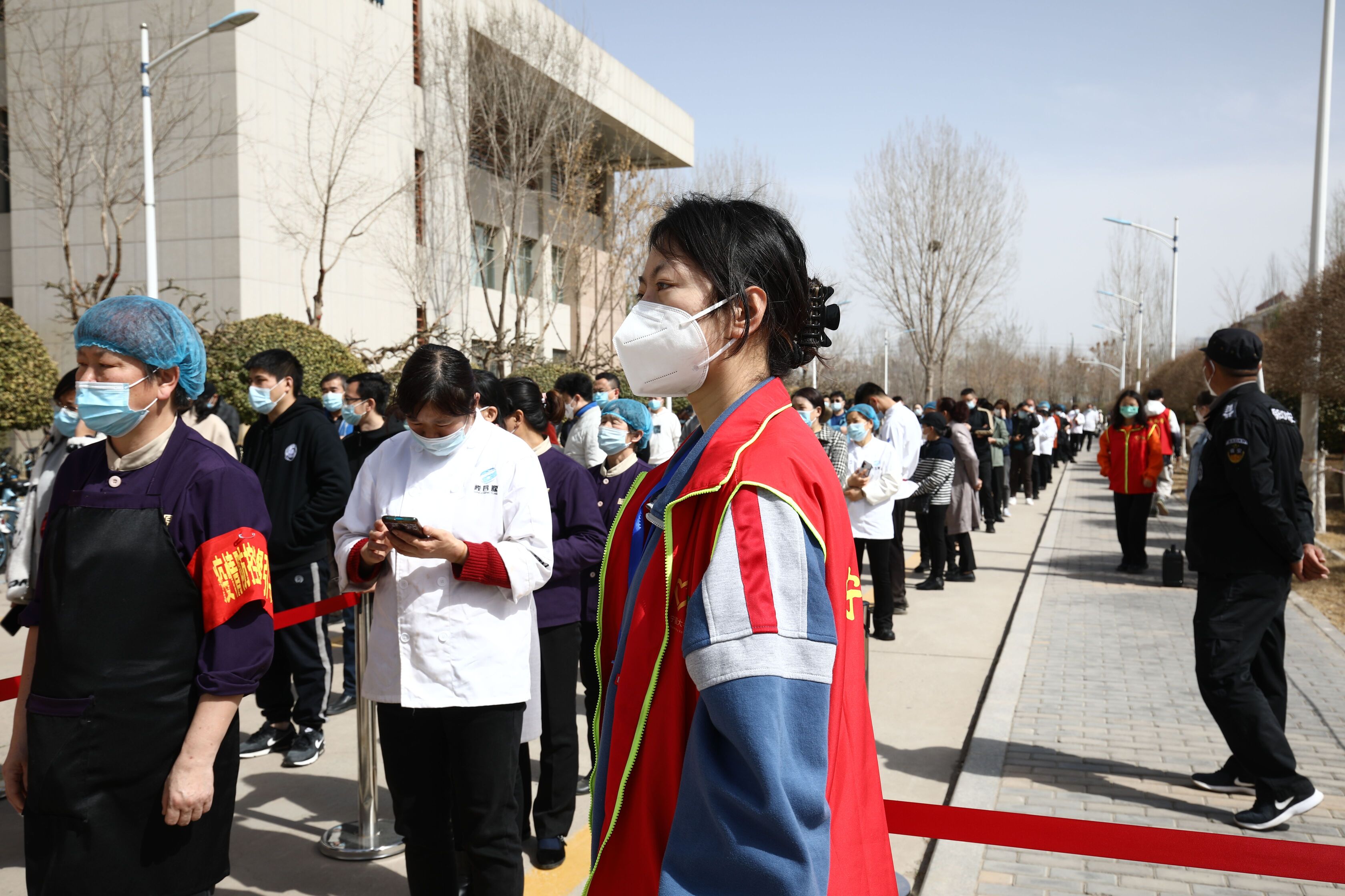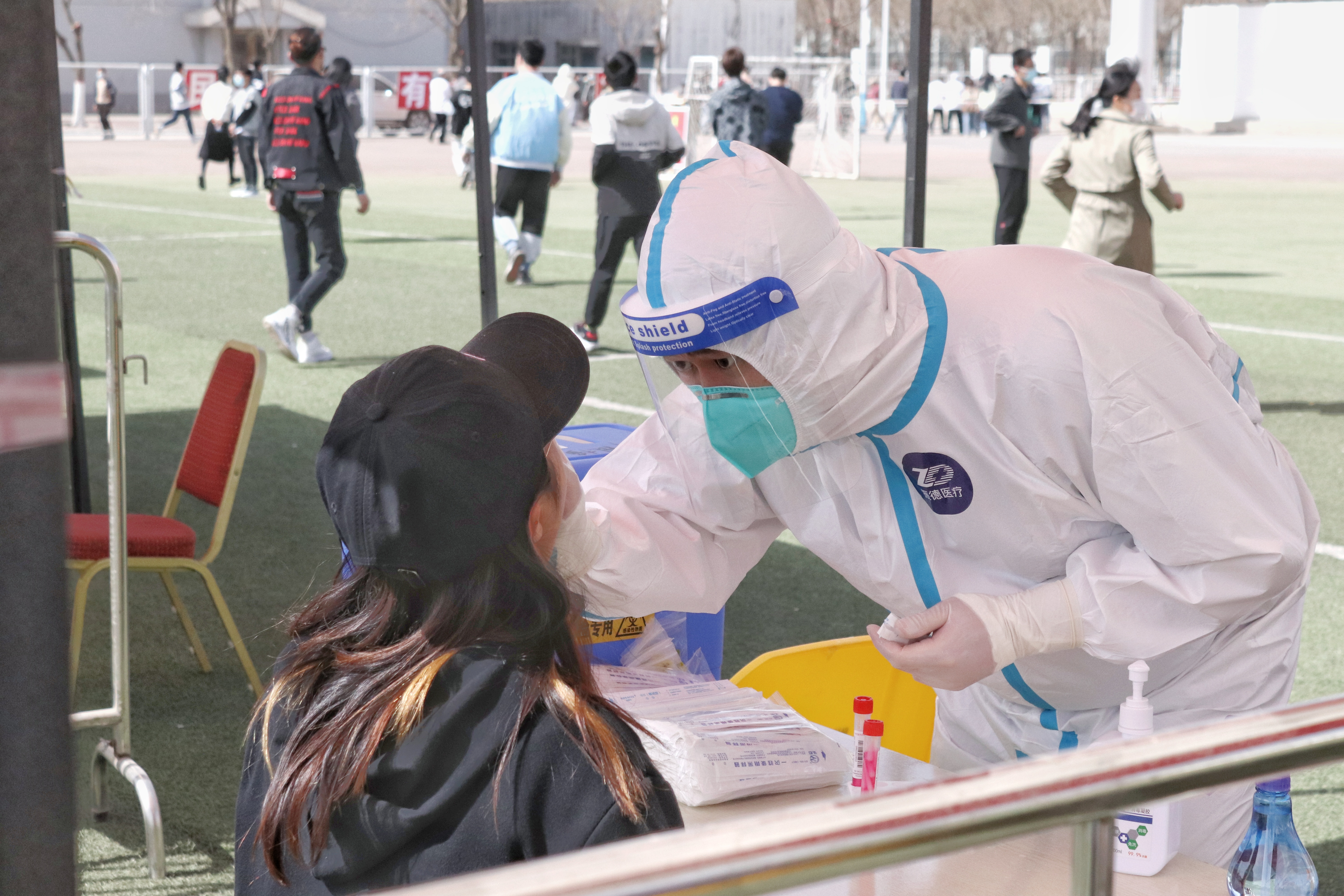 检测现场,师生员工分时段、分批次提前完成队伍集结,跟随志愿者的引导前往检测地点,在进入等候区时戴口罩间隔1米,登录“我的宁夏”进行身份核验、信息登记,经现场检查扫码验证后,每10人一组进入采样区,“请坐,将头微微后仰,张开嘴,啊——,可以了……。”整个检测流程从采样到离场,工作人员和受检人员各司其职、密切配合,现场调控指挥得当,保障队伍暖心服务,志愿者们无私奉献,历时近7个小时,共完成21648份咽拭子采样任务。
