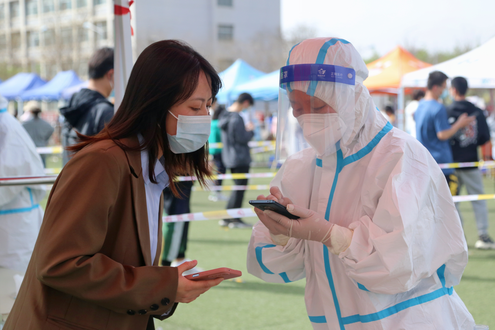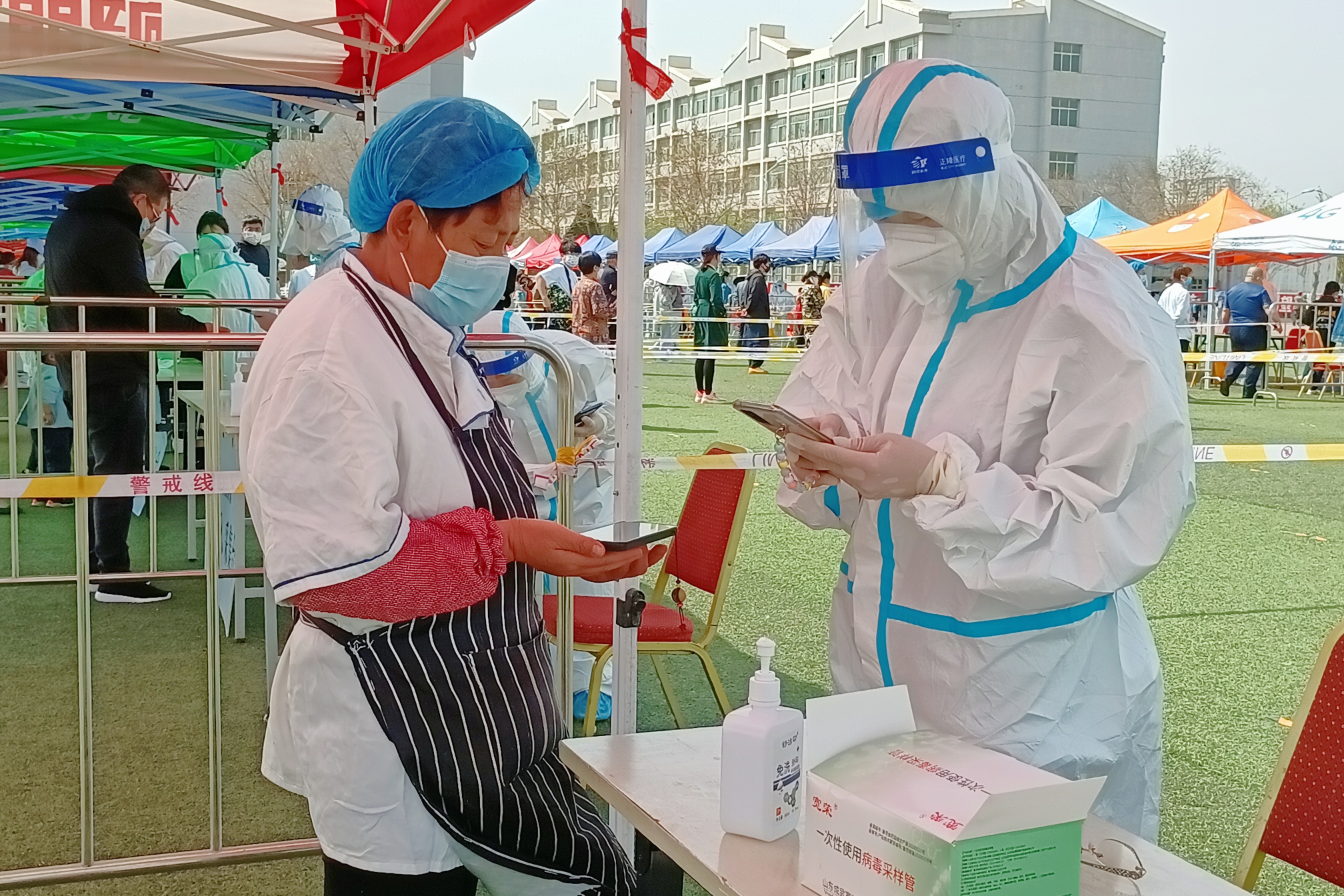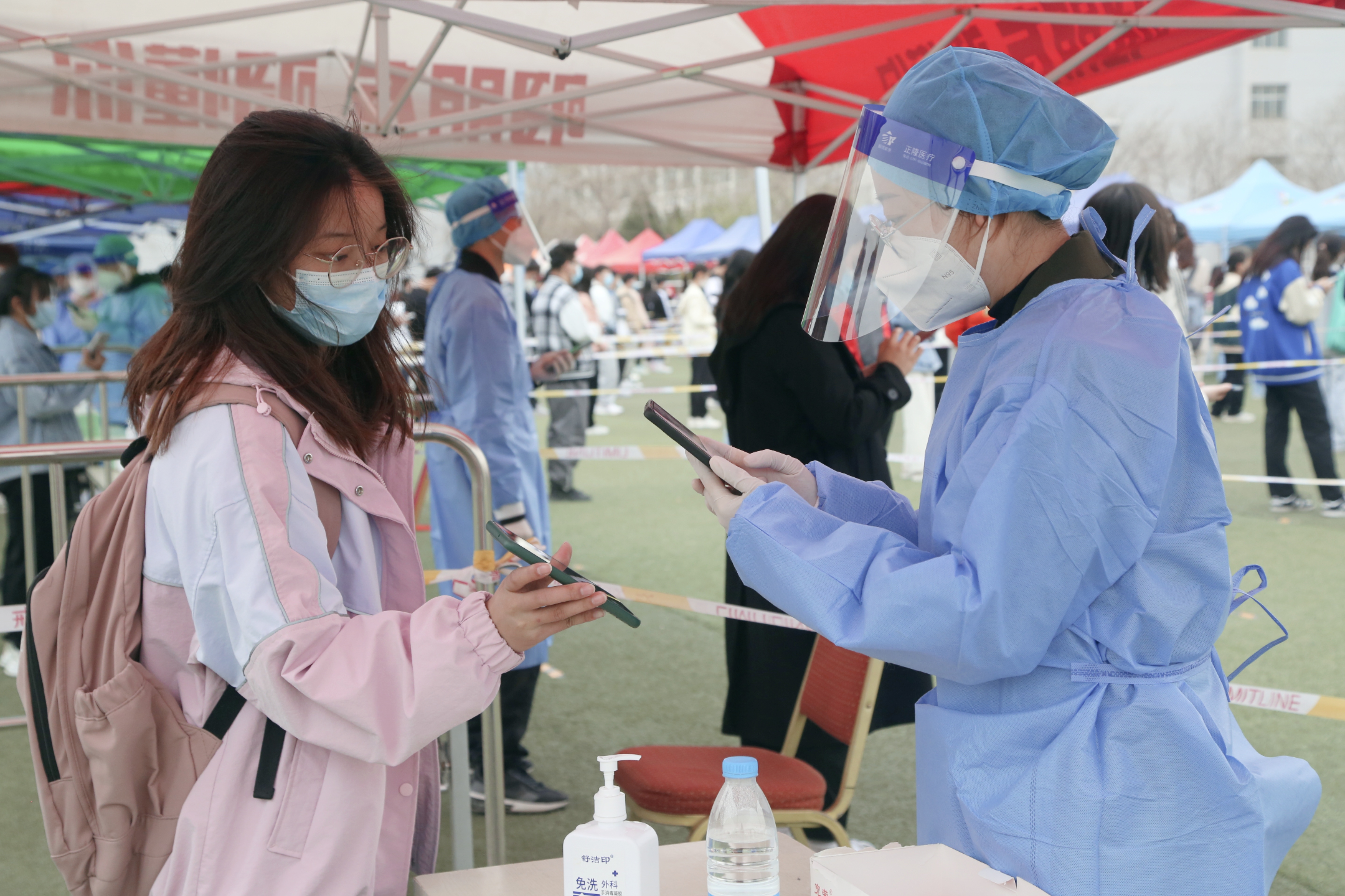 核酸检测现场,师生分时段、分批次陆续进入等候区,在工作人员引导下,十人一组,间隔一米,佩戴口罩,提前登陆“我的宁夏”,将健康融合码展示给采集信息的教职工志愿者,并接受医护人员的咽拭子样本采集。