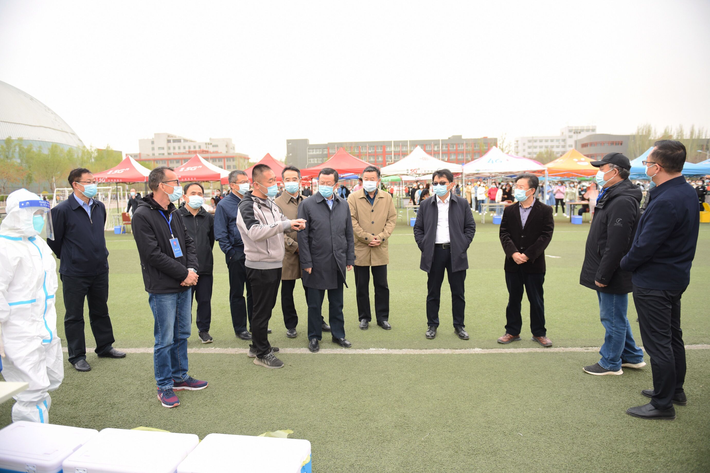 校领导在文萃校区核酸检测现场详细了解学校核酸检测的采集点设置、流程安排、服务保障、人员安排等具体情况,实地察看检测点防控措施落实等情况,亲切慰问现场医护人员、工作人员和志愿者,对他们的辛苦付出表示感谢,叮嘱他们一定要加强个人防护,注意劳逸结合,并勉励大家持续发扬众志成城、持续作战、甘于奉献、坚持到底的精神,以实际行动践行初心使命,守护校园平安。