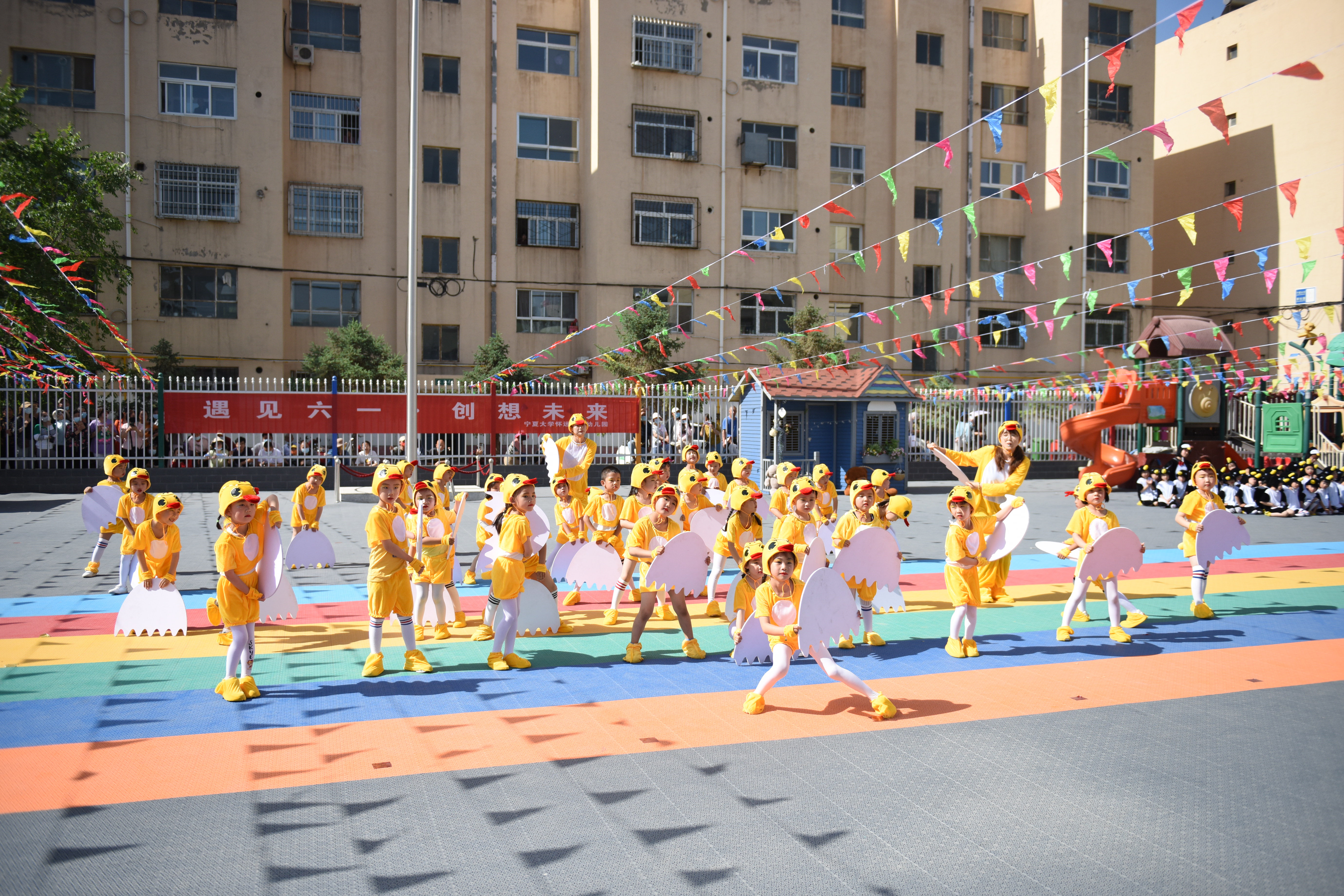 【澳门十大信誉网赌大全新闻中心讯 后勤保障部幼教服务中心/文 姬晓姗/图】一样的童年,不一样的精彩。孩子们期盼的“六一”儿童节在绿树成荫的日子里终于到来了,为庆祝专属孩子们的快乐节日,澳门十大信誉网赌大全怀远校区幼儿园开展了“遇见六一 创想未来”庆“六一”系列活动。校党委常委、副校长刘炎胜亲临活动现场,为全体师幼送上了节日的祝福。
