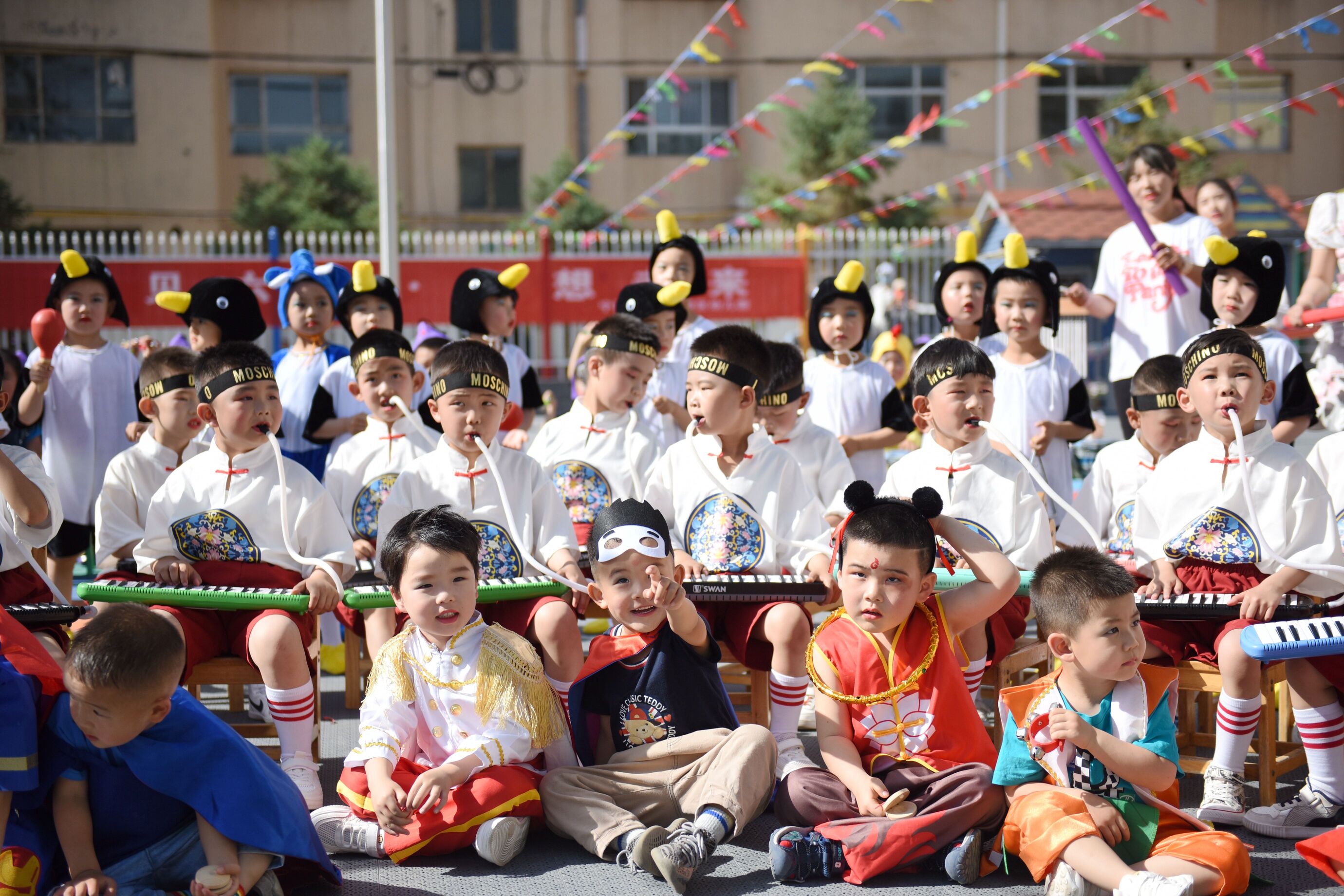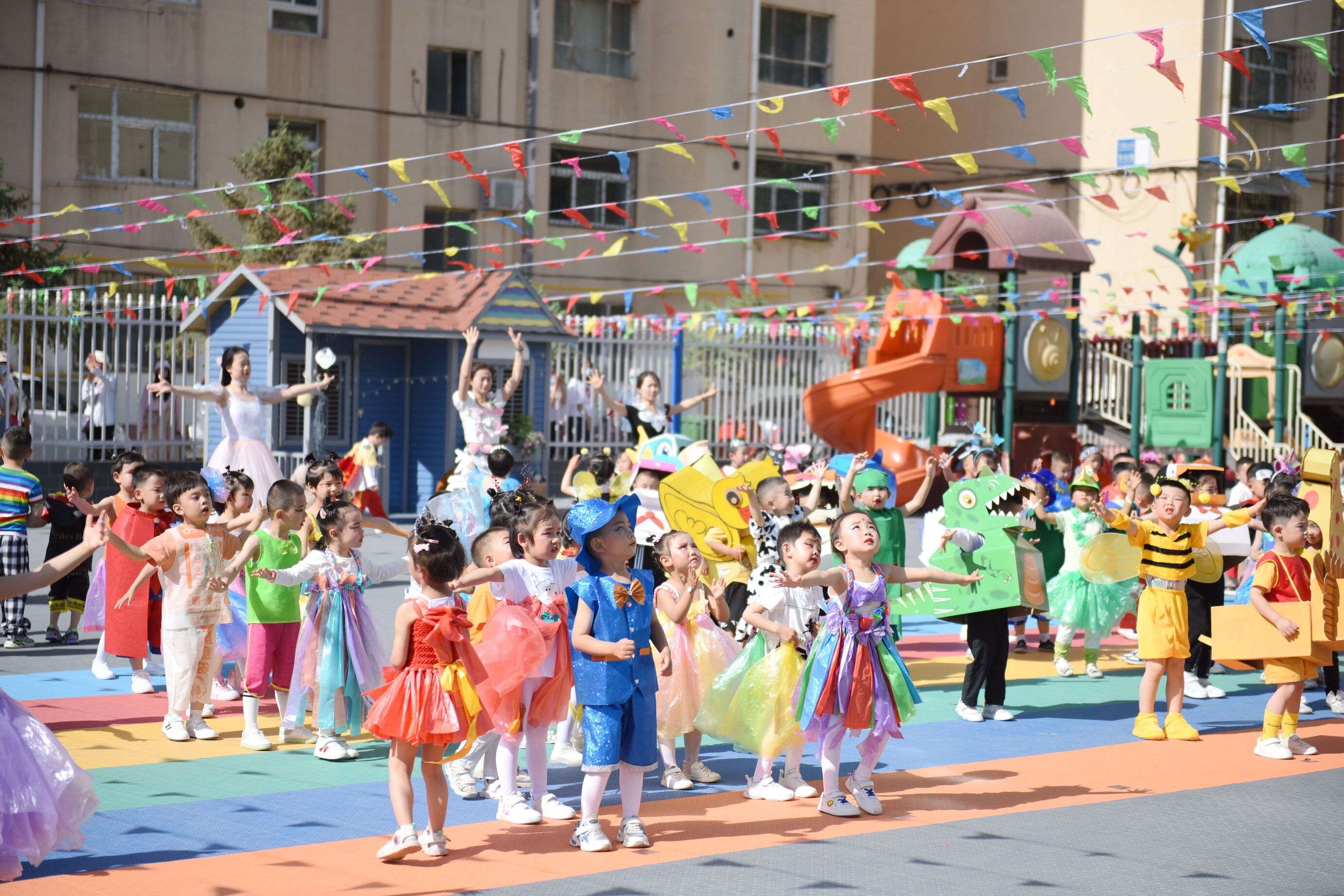 乐团表演《大地飞歌·音律四级》中,师幼化身小小节奏师献上一曲精彩震撼的打击乐串烧,孩子们热情高昂,欢快激扬的音符在耳边久久回荡;《环保“童”行·绿色未来》节目中,教师和小宝贝们身着精心制作的环保时装登台走秀,自信满满的脚步跟随音乐的节拍,可可爱爱的身影走出绿色的舞台;《动物狂欢·快乐四季》的表演中,小朋友们化身小动物开启一场盛大的森林狂欢节;《经典永流传·诗书话四季》的节目里,小朋友们畅游诗词的海洋,在优美的古典诗词韵律操中领悟中华文化的内涵,沐浴国学经典的魅力。