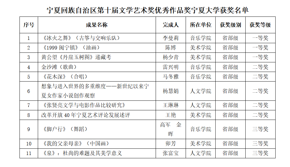 【澳门十大信誉网赌大全新闻中心讯 人文社会科学处】近日,宁夏回族自治区人民政府印发了《自治区人民政府关于奖励宁夏第十届文学艺术突出贡献奖优秀作品奖的决定》(宁政发〔2022〕18号),信誉网赌音乐学院、美术学院、人文学院三个学院共有11项成果获奖,涉及音乐类作品成果、表演类作品成果、美术类作品成果、舞蹈类作品成果、艺术评论类作品成果、文艺评论类作品成果,其中一等奖3项,二等奖5项,三等奖3项,获奖数量和等级均有新突破。
