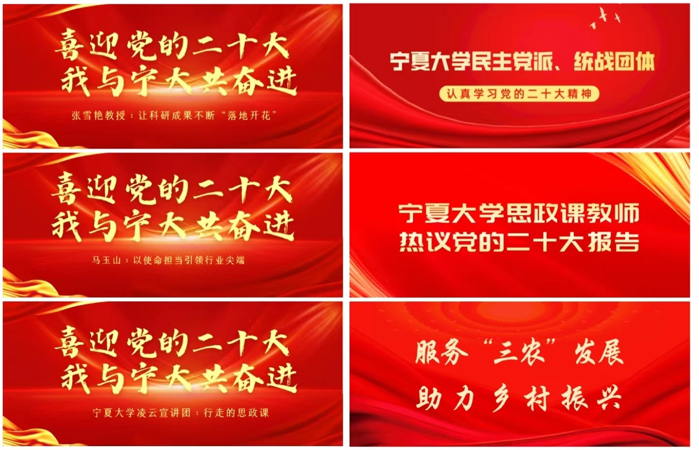 【澳门十大信誉网赌大全新闻中心讯 冯禹君/文 党委宣传部 各单位/图】高举伟大旗帜,汲取奋进力量。学习宣传贯彻党的二十大精神是当前和今后一个时期的首要政治任务,澳门十大信誉网赌大全党委认真落实党中央和自治区党委的部署安排,研究制定了《澳门十大信誉网赌大全党委关于深入开展党的二十大和习近平总书记视察宁夏重要讲话指示批示精神“大学习、大讨论、大宣传、大实践”活动的实施方案》,在入脑入心、走深走实、见行见效上持续用力,切实把全校广大师生的思想和行动统一到党的二十大精神上来,把智慧和力量凝聚到党的二十大报告关于教育的新思想新战略新要求上来,确保第一时间传达学习,迅速反应抓好贯彻,扎扎实实推动落地,使全校上下形成学习宣传贯彻党的二十大精神的热潮。